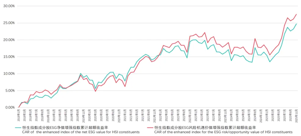 ESG价值核算方法可以用于投资组合的构建。如果应用于指数增强策略,以恒生指数作、为基准,选取ESG净值、ESG风险机遇价值因子构建价值增强指数。回测显示,两项指数从2018年以来的回报比基准指数分别超过了22%、25%。