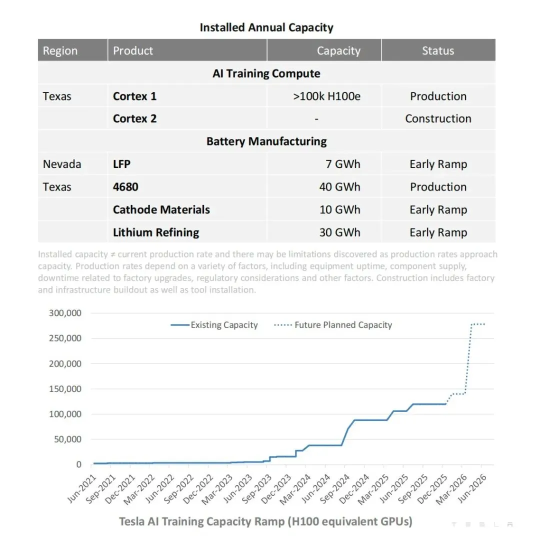特斯拉正在得州超级工厂打造 Cortex 2 算力集群,进一步提升人工智能训练算力规模。2026 年上半年,计划将得州超级工厂的本地算力规模提升超一倍(按 H100 等效算力计算)。现实世界模拟器持续强化 AI 训练,推动了智能辅助驾驶参数与性能提升。