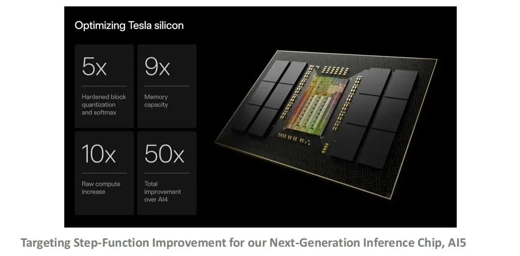 2025年第四季度,特斯拉自主研发、定制设计的 AI5 和 AI6 自动驾驶推理芯片持续取得进展,计划分别于 2027 年和 2028 年投入量产。相较于 AI4,AI5 的整体性能有望提升 50 倍,这主要得益于算力提升 10 倍、内存容量提升 9 倍,以及强化模块量化和 softmax 功能提升 5 倍(后者可在不牺牲模型精度的前提下,实现高效的低精度计算)。