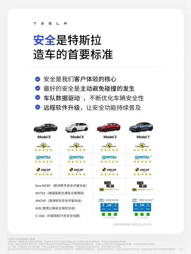 Model Y 蝉联多国销冠:中国市场近一年 SUV 销量冠军、连续四年中高端车型销量第一;连续四年蝉联美国电动汽车销量冠军;欧洲年度最受欢迎电动车;日本 2025 年最畅销电动车;挪威年度乘用车销冠。 特斯拉成为2025年中国最畅销的豪华车品牌,Model Y/3包揽近一年豪华车销量冠亚军。在2025年中国豪华车市场,特斯拉以超62.7万辆的销量成绩,超越奔驰宝马奥迪,稳居豪华车销量冠军。 S3XY 全系车型获全球权威安全机构五星安全评级:在美国 NHTSA、欧洲 Euro NCAP、中国 C-IASI、澳大利亚 ANCAP 等机构均获 “五星安全” 评级,2025 年现款 Model Y 再度斩获 Euro NCAP 与 ANCAP 五星认证。
