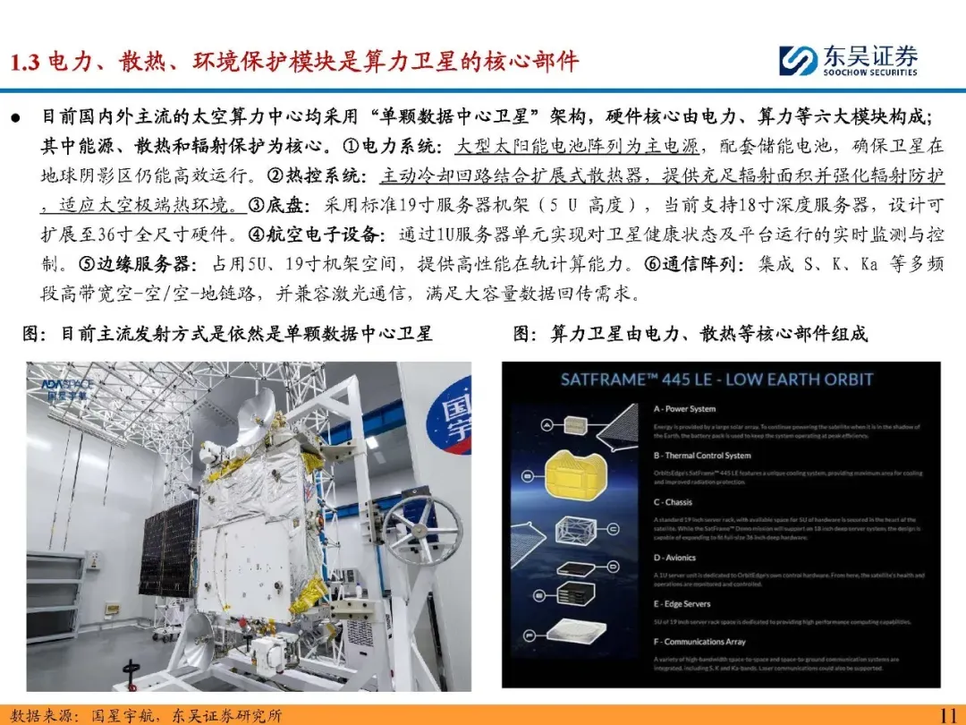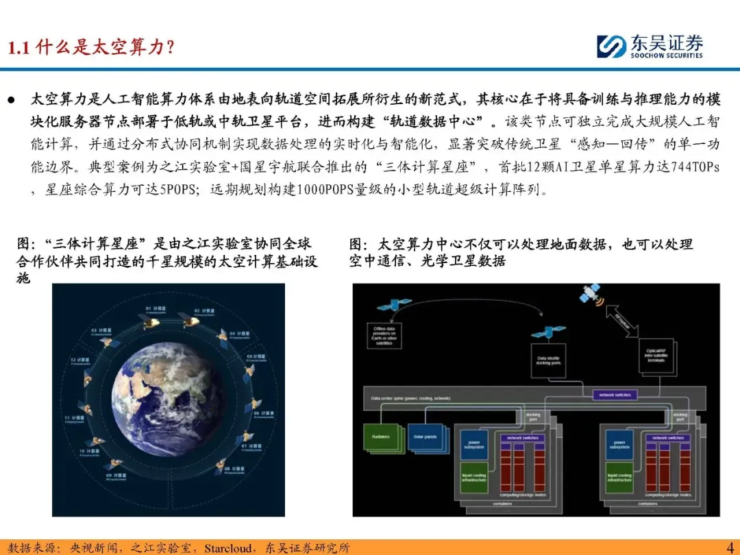在全球AI大模型推动下,数据中心电力缺口日益凸显,催生将高算力卫星部署于低/中轨的“太空算力”新形态。相比传统地面数据中心,太空算力具备部署效率高、能源效率佳、冷却成本低等颠覆性优势。以“之江实验室+国星宇航”推出的“三体计算星座”为例,首批已入轨12星,远期规划1000POPS算力规模;海外SpaceX、谷歌、英伟达投资的初创企业Starcloud加速推进百GW级太空算力集群建设。
