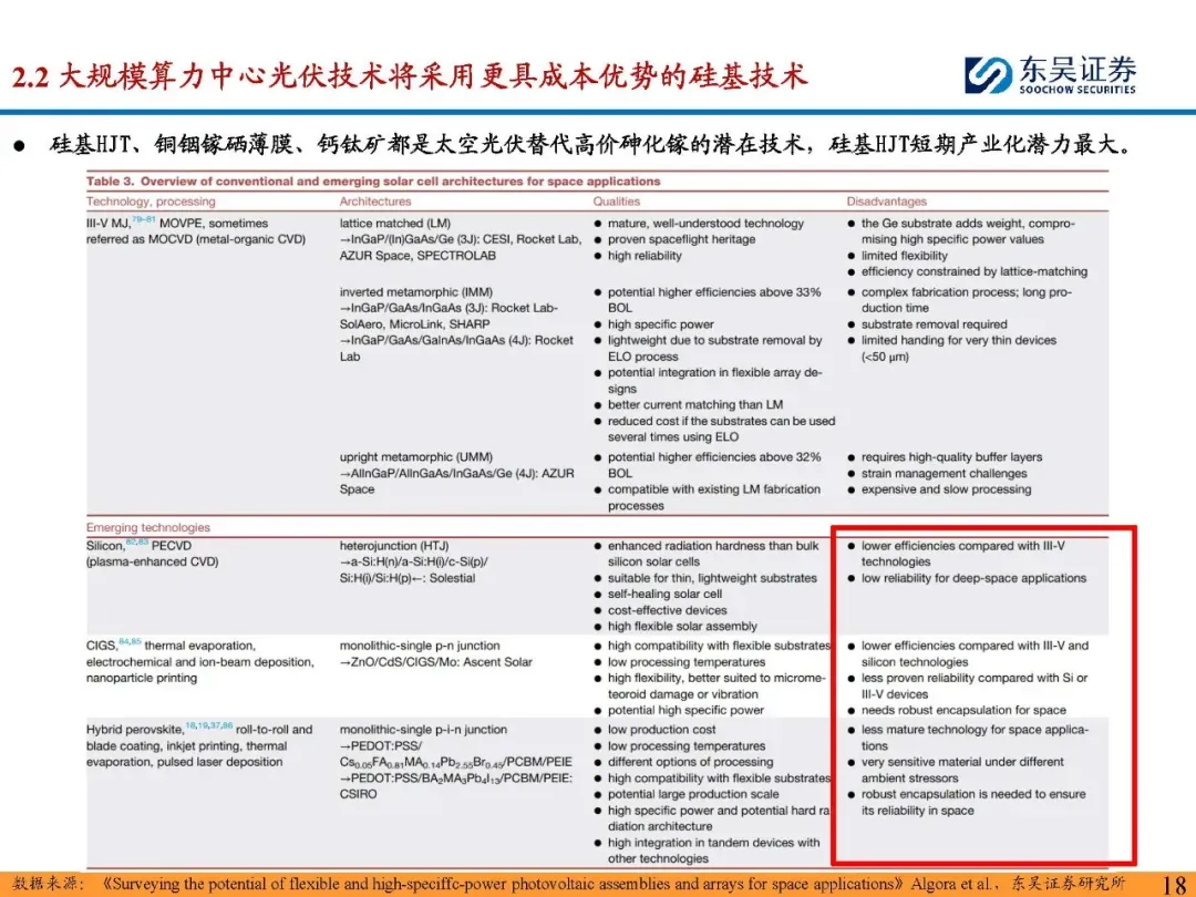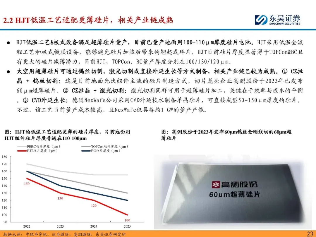 太空算力系统能源系统成本占比高达22%,决定卫星整体经济性。卷展式结构凭借轻量化、高功率质量比,逐步取代传统Z型结构,成为LEO轨道主流方案;但卷展式阵列仅适配柔性化、薄片化电池。硅基HJT电池凭借低温工艺、柔性兼容性和减重优势,最适配新一代卷展式光伏系统,海外NexWafe、Solestial等厂商已加速布局。同时,HJT亦为钙钛矿叠层的最优底电池,具备长期演进潜力。