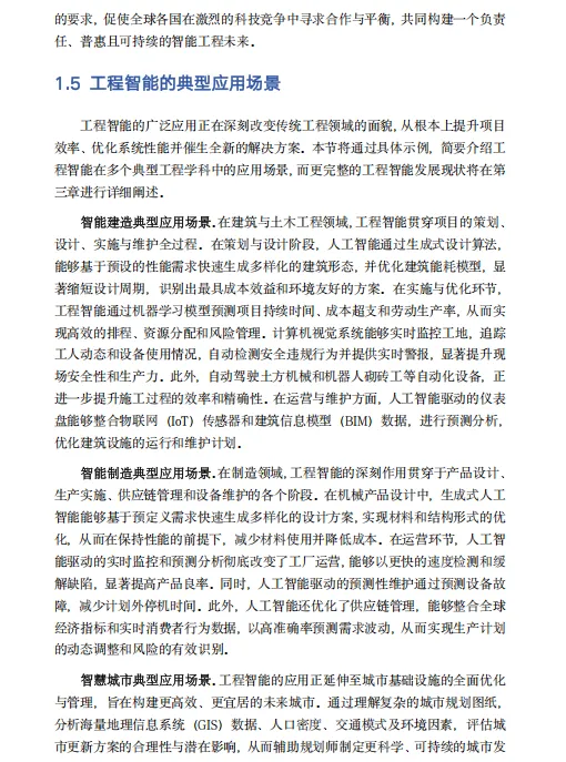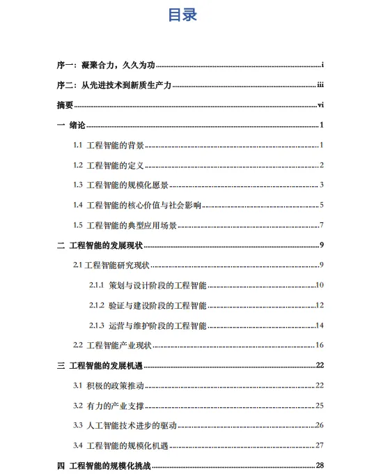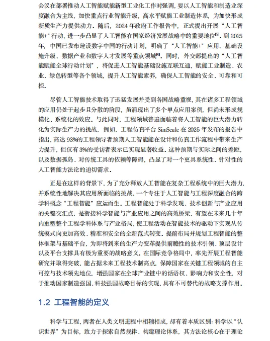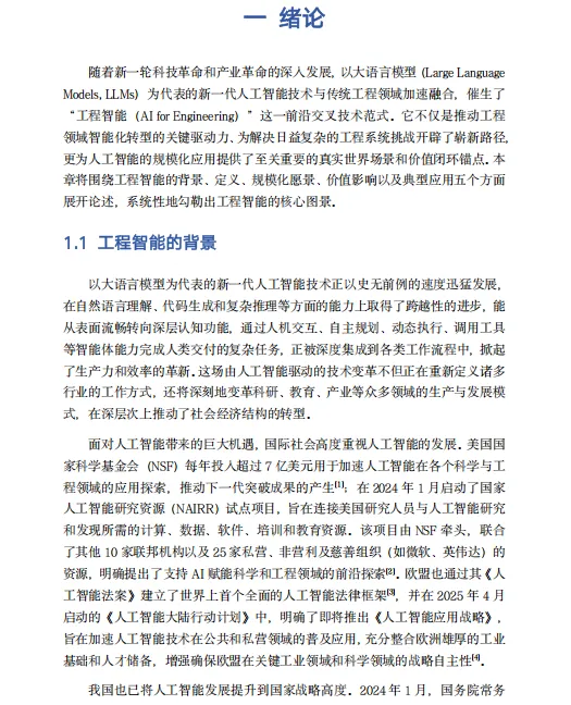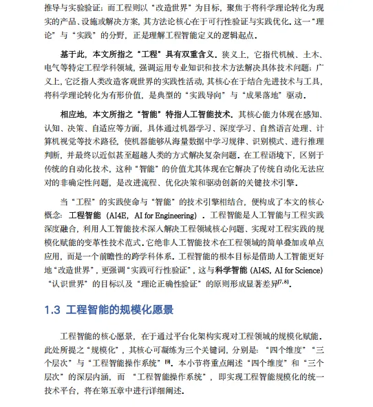《工程智能白皮书》是由同济大学工程智能研究院(IAIE)于2025年发布的系统性研究成果,全面阐述了"工程智能"(AI for Engineering, AI4E)这一前沿交叉领域的战略理念、技术框架与实现路径。该白皮书将工程智能定义为人工智能与工程实践深度融合的变革性技术范式,其核心目标并非简单地将AI技术叠加于工程领域,而是以"改造世界"为使命,通过构建"工程智能操作系统"(AI4E OS),实现对工程领域全生命周期的规模化赋能。