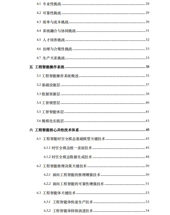 白皮书提出了工程智能发展的"四个维度"与"三个层次"战略框架:在维度上,追求技术研发、领域创新、人才培养与产业落地的全面规模化;在路径上,遵循从"点"(解决特定工程学科单点问题)到"线"(构建共性问题平台)再到"面"(形成完整学科研究与创新生态)的递进逻辑。为支撑这一愿景,文档系统性提出了"工程智能操作系统"的五层架构——涵盖基础设施层、数据资源层、工智模型层、工智智能体层及规模化实践层,并重点突破了时空全模态基础模型、可信赖推理决策、多智能体协同等核心共性技术。