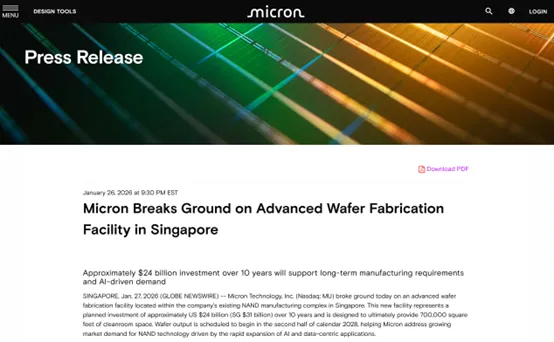 为应对持续紧张的供需局面,美光宣布未来十年将在新加坡追加240亿美元投资,新建NAND工厂,预计2028年下半年投产,新增约1600个岗位。
