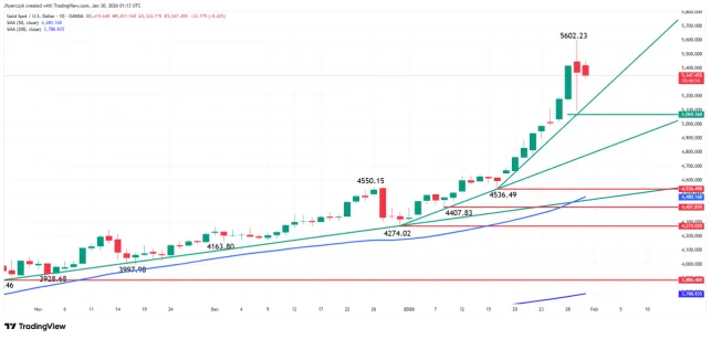 周四,由于获利了结,黄金价格暴跌超5%,随后触及5602.23美元的历史高位。在下跌过程中,白银价格也跟随下跌,一度逼近趋势线50%水平的支撑区域。