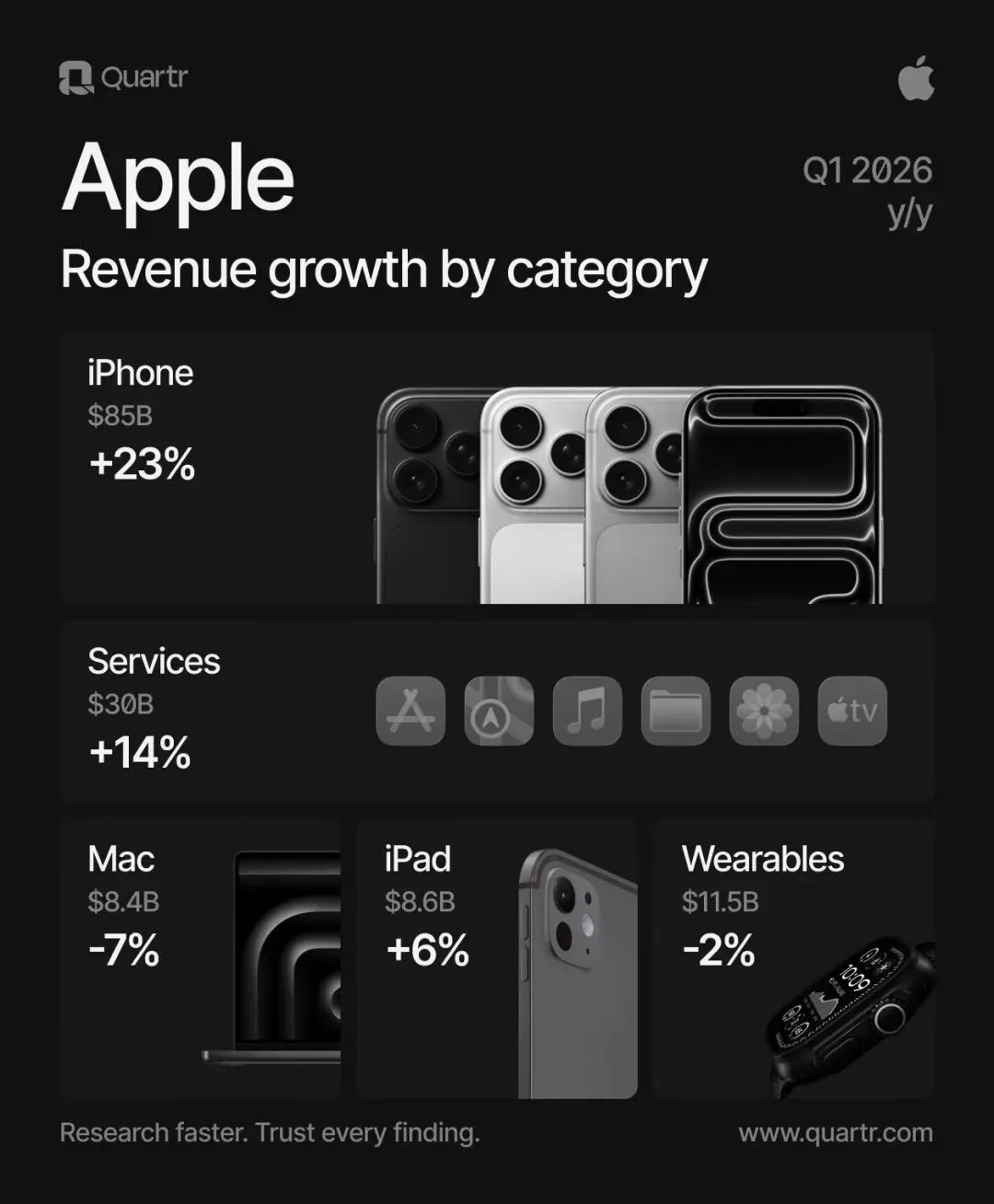 - 全球表现:iPhone营收$852.7亿美元(同比增长23%)。