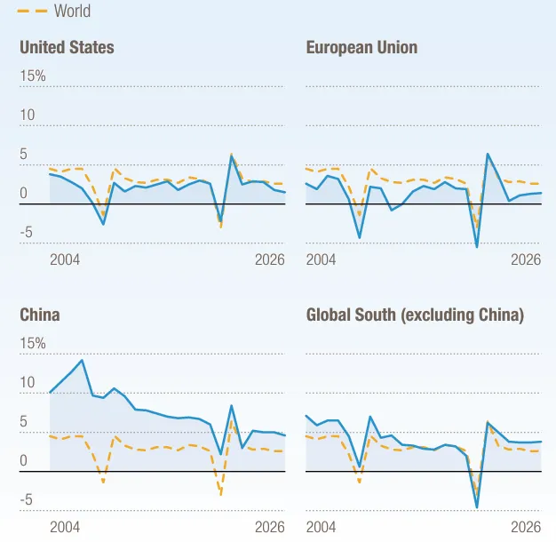 主要经济体增长也将失速。美国 2026 年增长率预计从 2025 年的 1.8% 降至 1.5%;而作为众多发展中国家重要贸易和投资伙伴的中国,增长率预计将从 2025 年的 5% 放缓至 2026 年的 4.6%。欧洲方面,德国等国的财政刺激措施可能仅能提供有限支撑,整体需求仍将保持温和 ³。