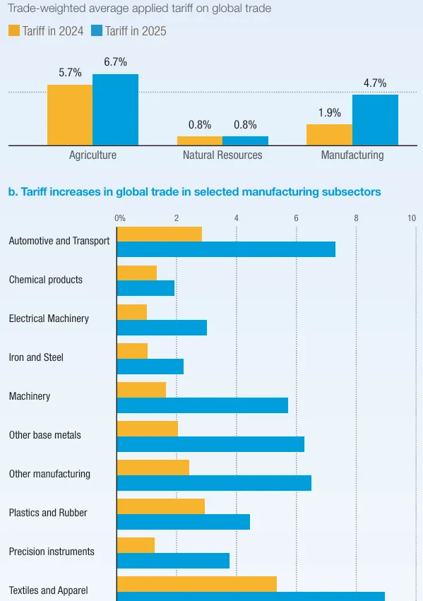 关税泛滥造成不确定性。2026 年,各国政府预计将继续把关税作为保护主义和战略工具。2025 年,在美国出于产业、地缘经济和地缘政治目标提高关税的带动下,关税在调控市场准入方面的作用显著扩大。其结果是全球平均关税上升,且对不同行业和贸易伙伴的影响不均衡(见图 2a、2b)。2026 年,各国政府将通过关税及其他贸易政策工具追求各类国内政策目标 —— 包括产业支持、强化产业政策、解决贸易失衡、调整现有及新贸易协定下的供应链重组与技术变革 —— 不确定性可能持续存在。