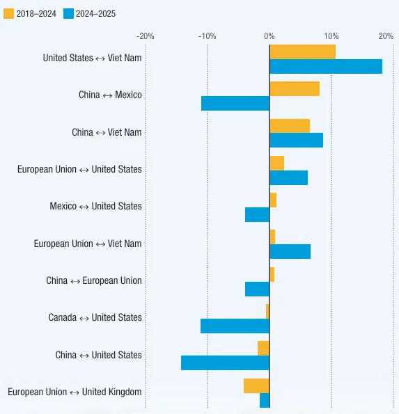 结构性转变正在改变贸易模式。全球近三分之二的贸易发生在全球价值链内部,其结构变化正在催生新的枢纽和路线。部分价值链活动集中的关键枢纽国家和货物服务流动的路线增长速度超过平均水平,而其他则呈下降趋势(见图 3)。尽管供应商多元化有助于增强韧性、稳定贸易,但也可能导致效率下降并拖累贸易增长。