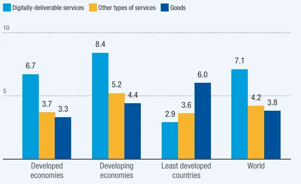 注:增长率为复合年增长率;数字可交付产品包括:保险和金融服务、电信服务、计算机和信息服务、知识产权使用费、研发服务、与贸易相关的技术、管理、咨询、工程、科学和建筑服务、视听服务,以及健康和教育个人服务、文化遗产和娱乐服务;数据来源为联合国贸发会议(UNCTAD)