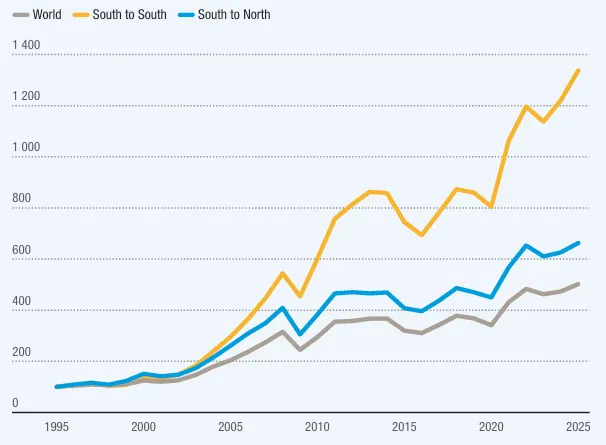 这一激增态势主要由亚洲区域价值链推动 —— 尤其是东亚和东南亚,其中中高技术制造业约占南南贸易的一半⁷。