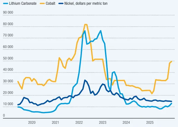 总体而言,2022 年以来的价格下跌反映了供应快速扩张、电池需求增速低于预期以及降低矿产密集度的技术变革 ¹⁰。这些趋势预计将在 2026 年持续。