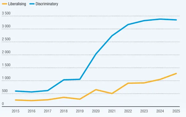 扭曲贸易的措施正在增加。各国政府越来越多地使用贸易措施来追求安全、产业、公共卫生和环境等领域的国内目标。2020 年以来,全球已记录约 18000 项新的歧视性贸易措施(见图 10),标志着保护主义的急剧抬头。如今,技术法规和卫生标准影响着约三分之二的全球贸易,涉及贸易额达 2.6 万亿美元。大国还在向海外推广自身标准,可能形成相互竞争的监管集团,迫使小国选边站队。此外,贸易政策正被应用于气候和社会目标 —— 例如碳边境税以及与森林砍伐或劳工标准相关的进口壁垒。这些举措旨在实现重要目标,但也给出口商带来了新的合规负担。
