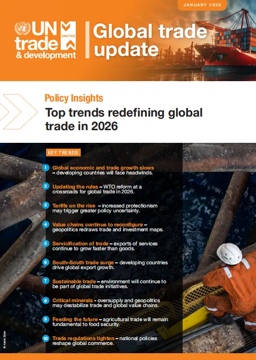全球经济与贸易增长放缓 —— 发展中国家将面临多重阻力 规则更新 ——2026 年世贸组织(WTO)改革处于全球贸易的十字路口 关税攀升 —— 保护主义抬头或引发更大政策不确定性 价值链持续重构 —— 地缘政治重塑贸易与投资格局 贸易服务化 —— 服务出口增长继续快于货物贸易 南南贸易激增 —— 发展中国家引领全球出口增长 可持续贸易 —— 环境议题持续融入全球贸易倡议 关键矿产 —— 供应过剩与地缘政治或扰乱贸易及全球价值链 保障未来粮食供应 —— 农产品贸易仍是粮食安全的基石 贸易监管收紧 —— 国家政策重塑全球商业格局
