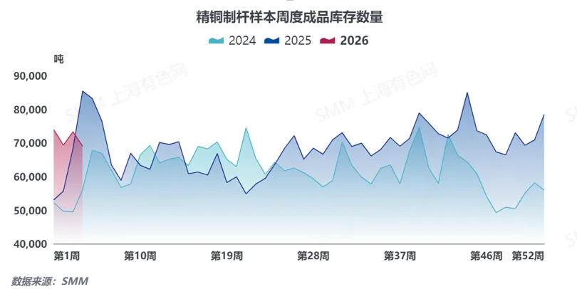 2025年,精铜杆行业产能严重过剩、供需关系失衡的核心矛盾贯穿全年叠加铜价剧烈波动,行业运行呈现明显的上下半年分化态势。上半年,受铜价跌停及光伏抢装带来的阶段性需求提振,行业开工率维持高位运行;下半年铜价开启陡峭上行,SMM1#电解铜均价突破10万元/吨关口并创下历史新高,原料端影响快速传导,下游线缆、漆包线市场需求不振、新增订单疲软,加工费持续承压,企业利润空间不断收窄,行业整体开工率长期处于正常水平以下。精铜杆开工与铜价走势呈现显著负相关性,随铜价走高逐步回落,充分体现出高铜价与弱需求对生产开工的双重制约。值得关注的是,铜价上涨前期,企业为维持市场份额暂保持常规开工,但下游采购需求持续收缩,成品库存已率先进入累库周期,下半年库存整体呈波动抬升态势,进一步加剧行业经营压力,最终陷入“需求疲软—库存高企—盈利承压”的阶段性困境。