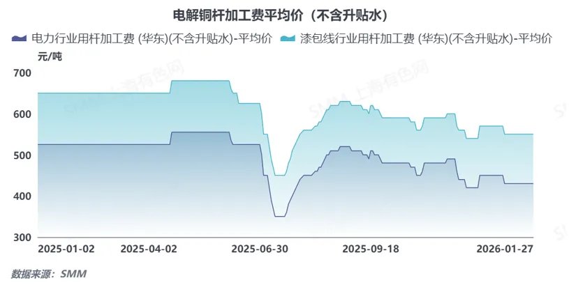 从加工费维度来看,2025年电力、漆包线行业精铜杆加工费波动显著。6月适逢半年度节点,企业冲刺生产任务叠加贸易商激烈竞争,加工费承压下探,月内甚至出现零加工费情况;半年度节点过后加工费逐步修复至正常水平,后续受铜价持续走高影响,加工费再度回落,展望2026年,精铜杆行业产能严重过剩、供需失衡的核心矛盾仍将持续,行业内企业为争夺有限订单,市场竞争将进一步加剧,内卷态势难以快速缓解,持续对加工费水平形成压制。因此SMM预期2026年精铜杆加工费整体仍将承压运行,延续偏弱下行的走势。