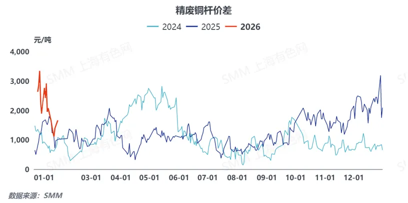 沪铜主力合约价格持续冲高,理论上大幅打开了精废价差的替代空间,价差持续走扩也使得线缆企业萌生采购再生铜杆以降低成本的意愿,不少精铜杆企业因此担忧再生杆会对其市场形成挤压。但受反向开票政策执行扭曲、清理地方税收洼地带来的政策不确定性,叠加企业票据额度紧缺、资金链紧张等因素影响,再生杆企业生产与销售意愿始终疲弱,停产观望现象突出,行业开工率持续偏低,因此尽管铜价走高带动精废价差扩大,再生铜杆对精铜杆市场的实际冲击,并未达到市场此前的预期程度。