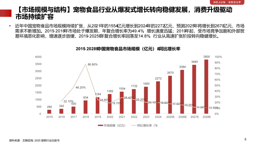 但与早期年均30%以上的爆发式增长相比,2019年以来行业增速明显回落,2019–2025E年复合增长率降至14.8%。伴随市场基数扩大、养宠渗透率提升趋缓,单纯依赖用户数量扩张和渠道红利驱动增长的时代正在结束,行业发展逻辑由规模驱动转向结构驱动。