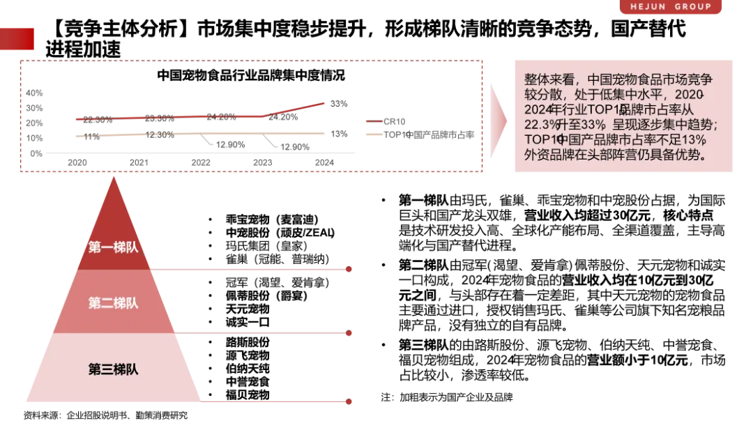从竞争格局看,中国宠物食品行业已由早期外资品牌垄断,进入国际巨头与国产龙头并存的充分竞争阶段,国产替代加速。数据显示,2020–2024年行业TOP10品牌市占率由22.3%提升至33%,集中度稳步提升;但国产品牌在头部阵营中的占比仍不足13%,外资品牌在高端市场和专业渠道仍具优势。