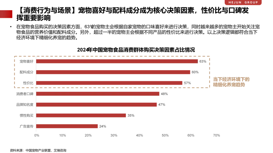 从消费端看,宠物食品需求正在发生深刻变化。在养宠理念升级背景下,宠物主对食品的关注重点,正从“是否愿意吃”转向“是否长期健康”。调研显示,宠物喜好、配料成分已成为最核心的购买决策因素,价格敏感度依然存在,但已让位于精细化养宠的长期价值判断。