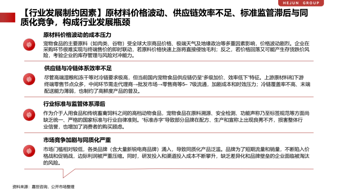 上游原材料价格波动频繁,肉禽类与农作物价格受全球大宗商品、气候与地缘因素影响显著,企业面临较大的成本与库存管理压力;中游环节企业数量庞大,同质化产品泛滥,价格战侵蚀利润空间;同时,行业标准与监管体系仍在完善过程中,在原料溯源、功能宣称与标签规范等方面存在认知差异,既增加了消费者决策难度,也对优质企业的长期品牌建设形成制约。