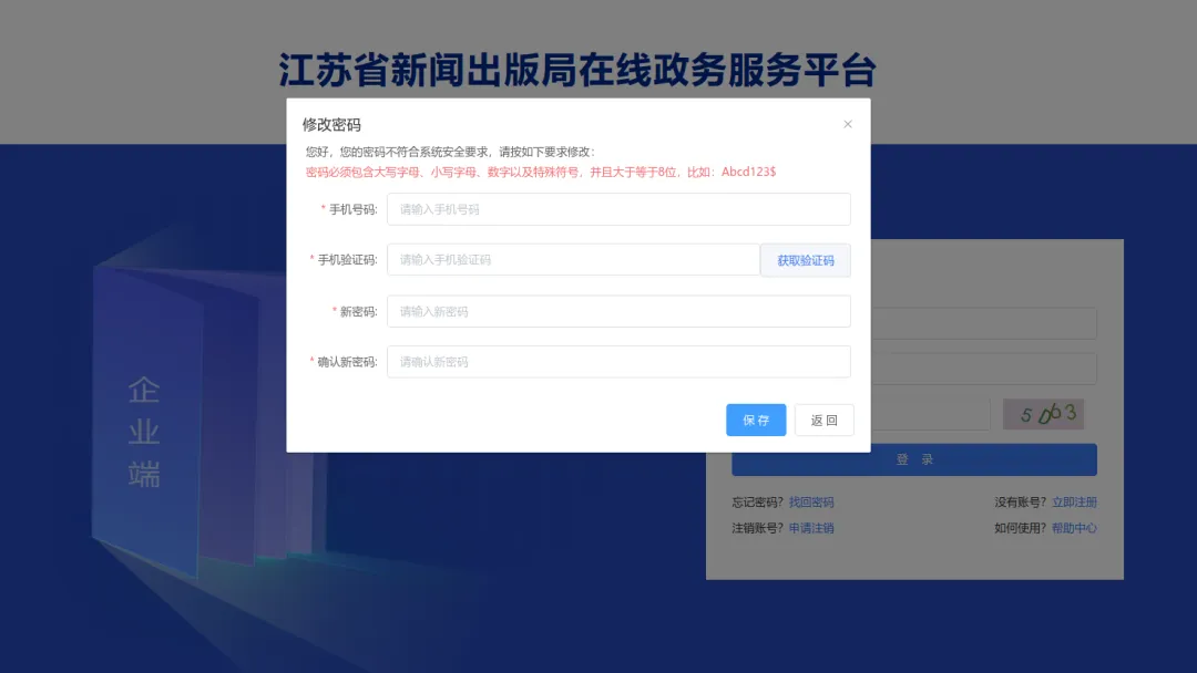 (3)、首次登录系统的用户初始密码为新出印字号,由于是纯数字,需要强制用户修改密码,页面如下所示,用户可绑定联系人手机号码获取验证码、重新设置密码: