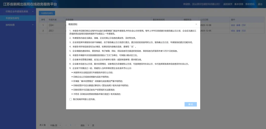 勾选“我已知晓并同意上述内容”,点击【确定】按钮,进入年报填写页面。