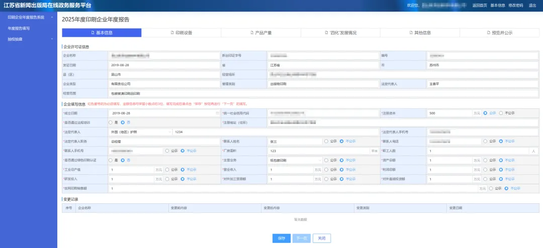 企业进入年报信息填写页面【基本信息】,基本包括企业许可证信息、企业填写信息、变更记录,自动带入企业信息,页面信息填写完后点击页面下方【保存】按钮。