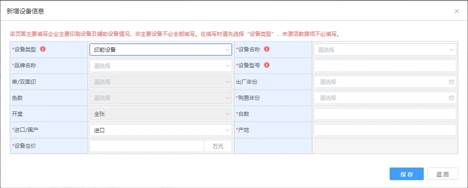 点击【新增】按钮,弹出“新增设备信息”页面,当设备类型选择“印中设备”时,所有数据均可填写,当选择“印前设备”或“印后设备”时,“单/双面印、色数、开度”默认灰化不可选择,如下图: