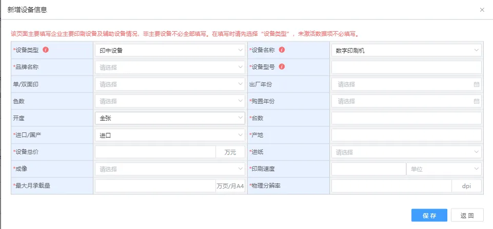 当设备类型选择“印中设备”,设备名称选择“数字印刷机”时,需要额外填写“成像、印刷速度、最大月承载量、物理分辨率”,如下图: