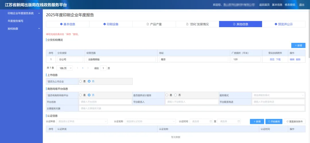 其中“数字印刷机装机数量”根据前面“印刷设备”模块中的数字印刷机数量自动带入,该页面不可修改此项信息。其他信息根据实际情况自行填写。