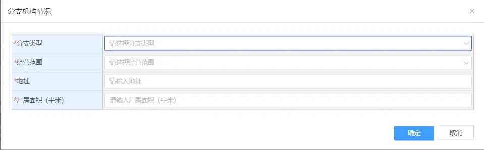 分支机构信息为非必填项,请根据实际情况选择性填写。分支机构情况模块点击【新增】,弹出分支机构填写页面,页面如下: