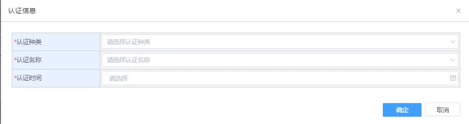 填写完成后点击【确定】即可,可根据“认证种类”、“认证名称”、“认证时间”查询已经录入的认证信息。