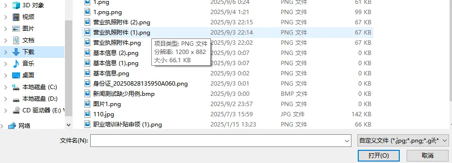 相关信息营业执照点击【点击上传】按钮,上传相关附件,点击后弹出附件上传弹窗,页面如下: