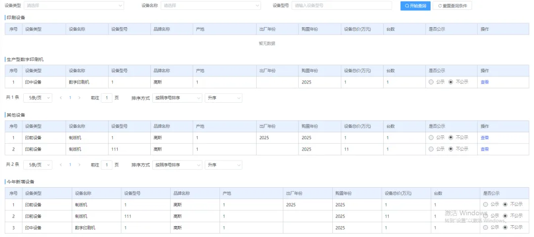 已经录入的印刷设备信息,可根据“设备类型”、“设备名称”、“设备型号”进行查询。