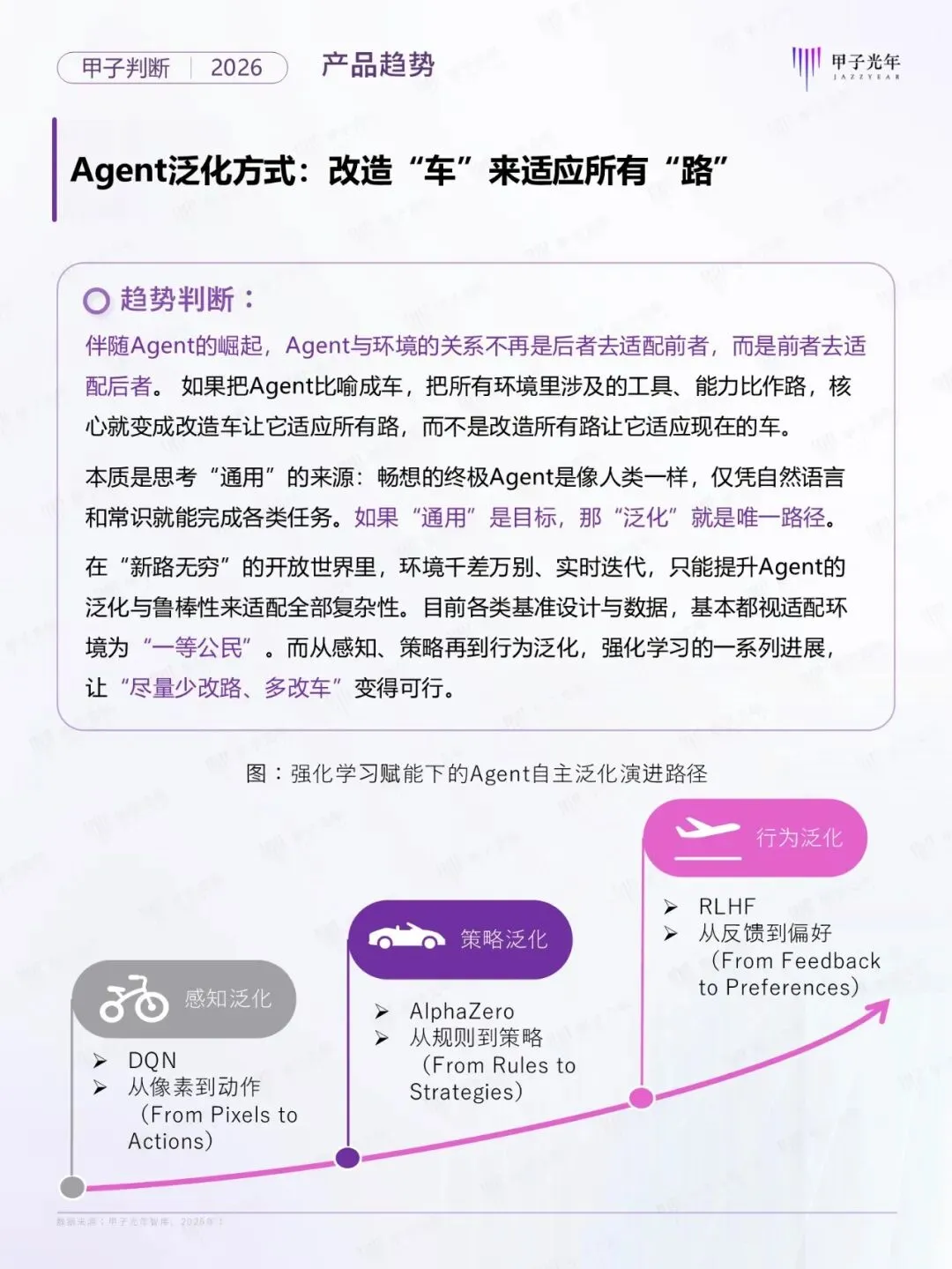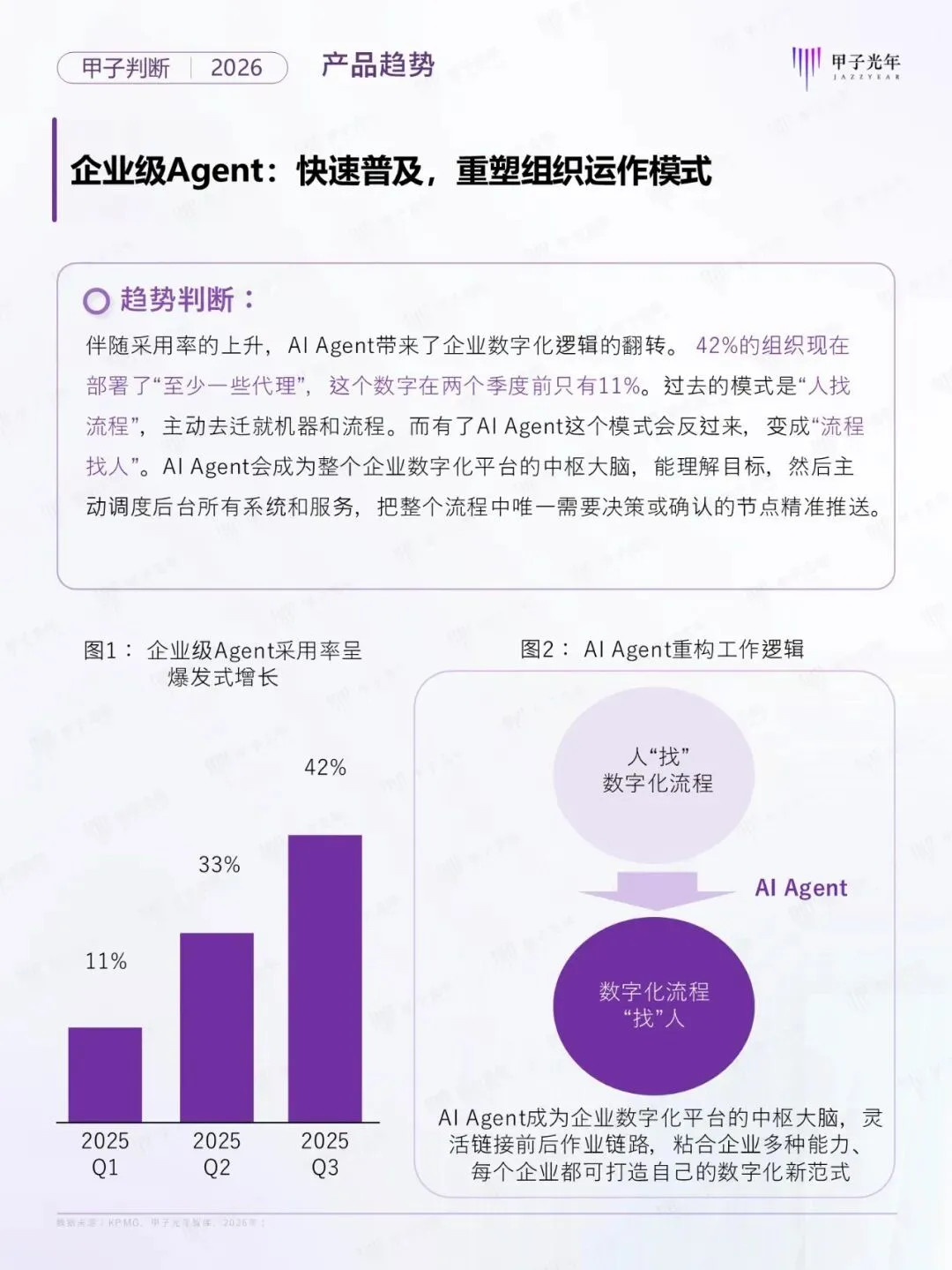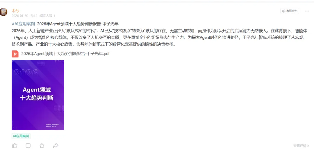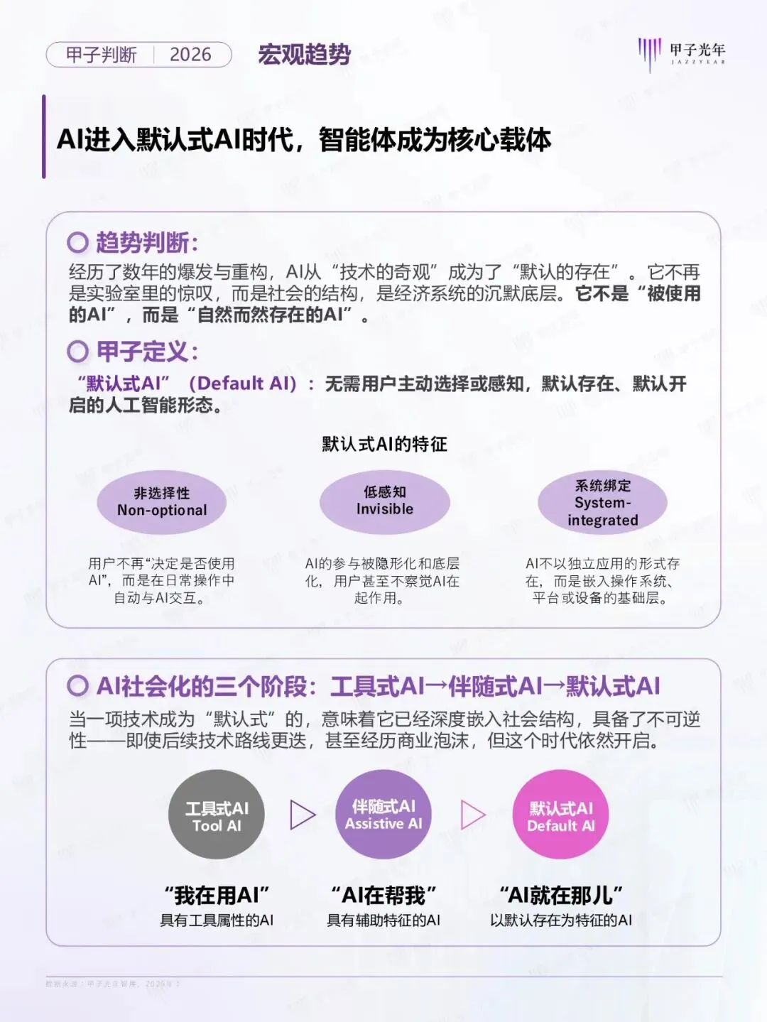 2026年,人工智能产业正步入“默认式AI的时代”。AI已从“技术热点”转变为“默认的存在,无需主动感知、而是作为默认开启的底层能力无感嵌入。在此背景下,智能体(Agent)成为智能的核心载体,不仅改变了人机交互的本质,更在重塑企业的组织形态与生产力。为探索Agent时代的演进路径,甲子光年智库系统的梳理了从宏观、技术到产品、产业的十大核心趋势,为智能体新范式下的数智化变革提供前瞻性的决策参考。公号后台回复“9”,在AI大模型·领地知识星球查看~......文│甲子光年