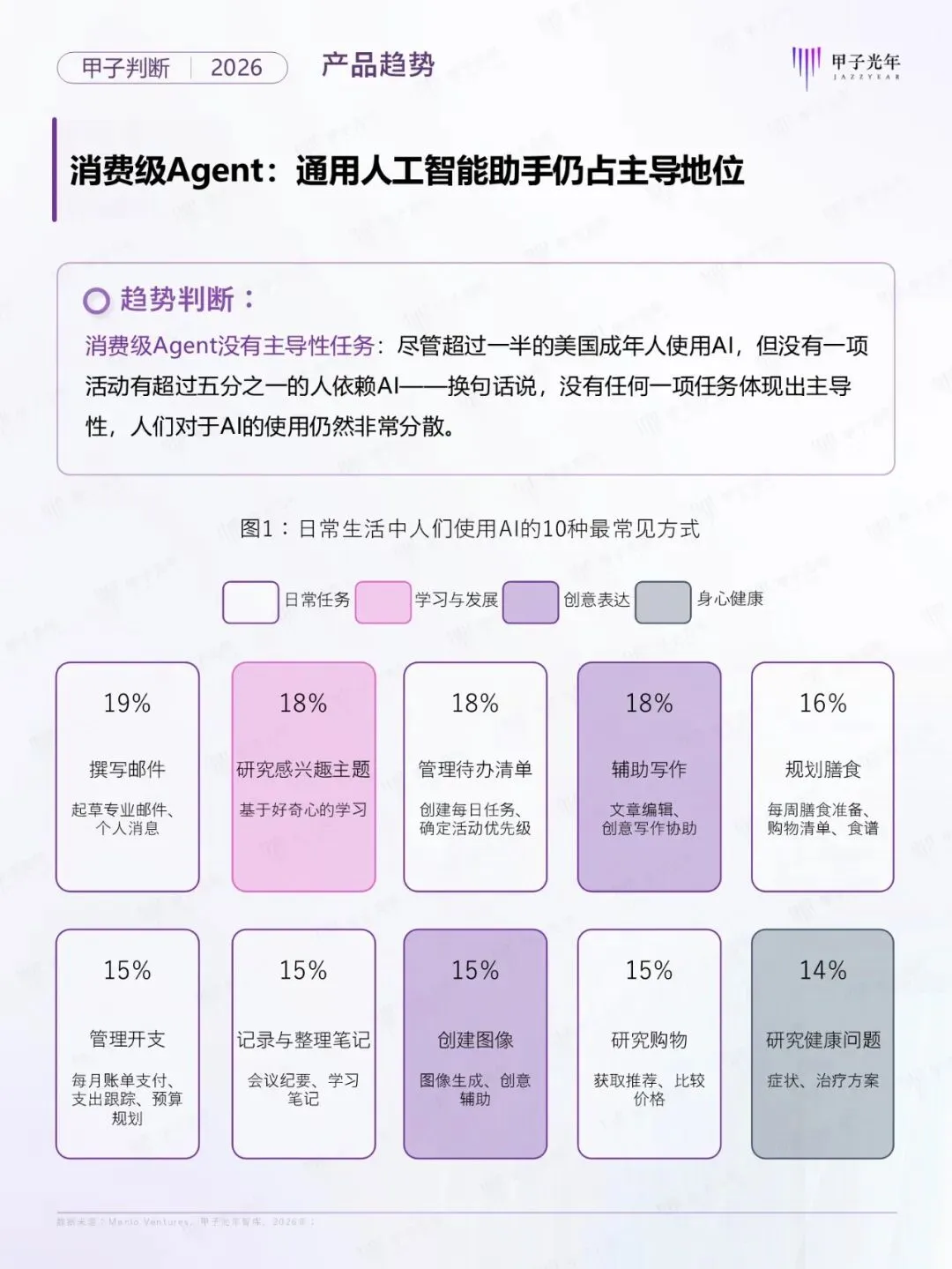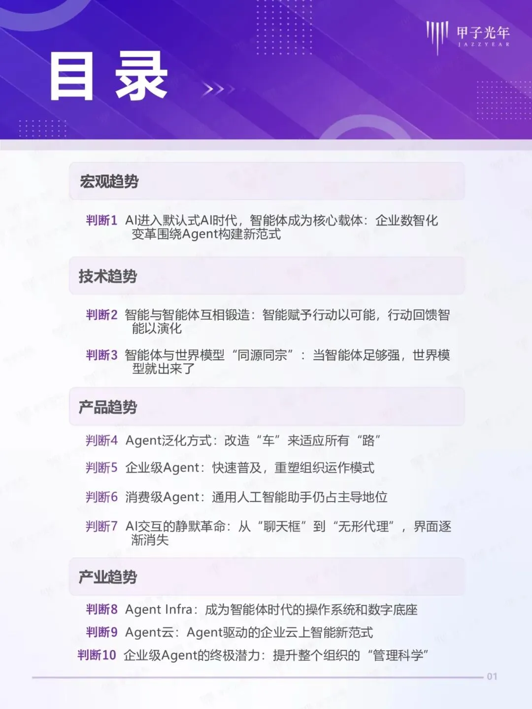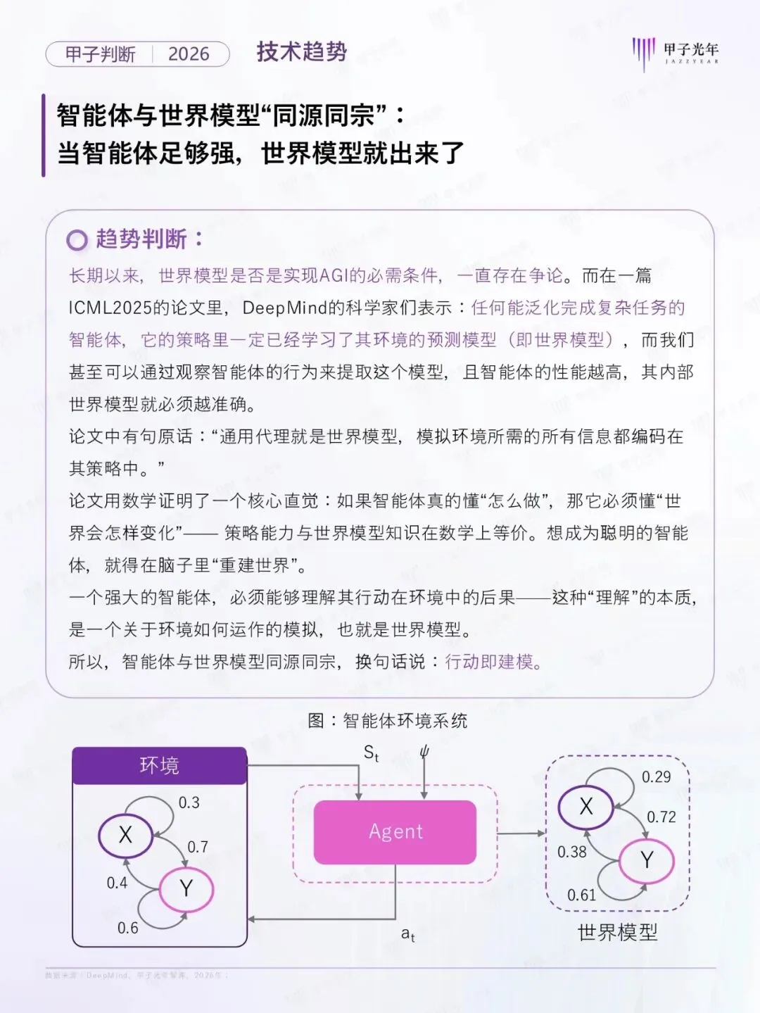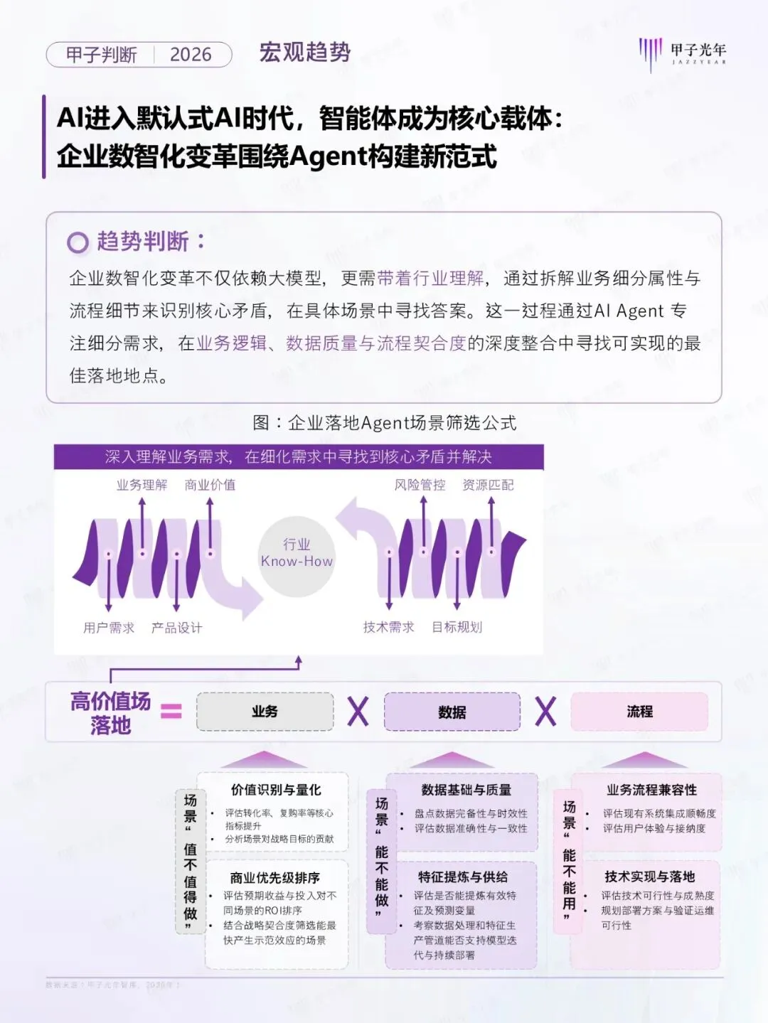 2026年,人工智能产业正步入“默认式AI的时代”。AI已从“技术热点”转变为“默认的存在,无需主动感知、而是作为默认开启的底层能力无感嵌入。在此背景下,智能体(Agent)成为智能的核心载体,不仅改变了人机交互的本质,更在重塑企业的组织形态与生产力。为探索Agent时代的演进路径,甲子光年智库系统的梳理了从宏观、技术到产品、产业的十大核心趋势,为智能体新范式下的数智化变革提供前瞻性的决策参考。公号后台回复“9”,在AI大模型·领地知识星球查看~......文│甲子光年