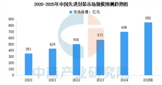 而在中国,得益于5G、物联网、AI等新兴技术的需求,以及HPC与存储解决方案需求的日益增加,中国先进封装市场规模快速增长。中商产业研究院发布的《2025-2030年中国封装测试行业深度分析及发展趋势研究预测报告》显示,中国先进封装市场规模由2020年的351亿元增长至2024年的698亿元,同期年复合增长率为18.7%。中商产业研究院分析师预测,2025年中国先进封装市场规模达到852亿元。
