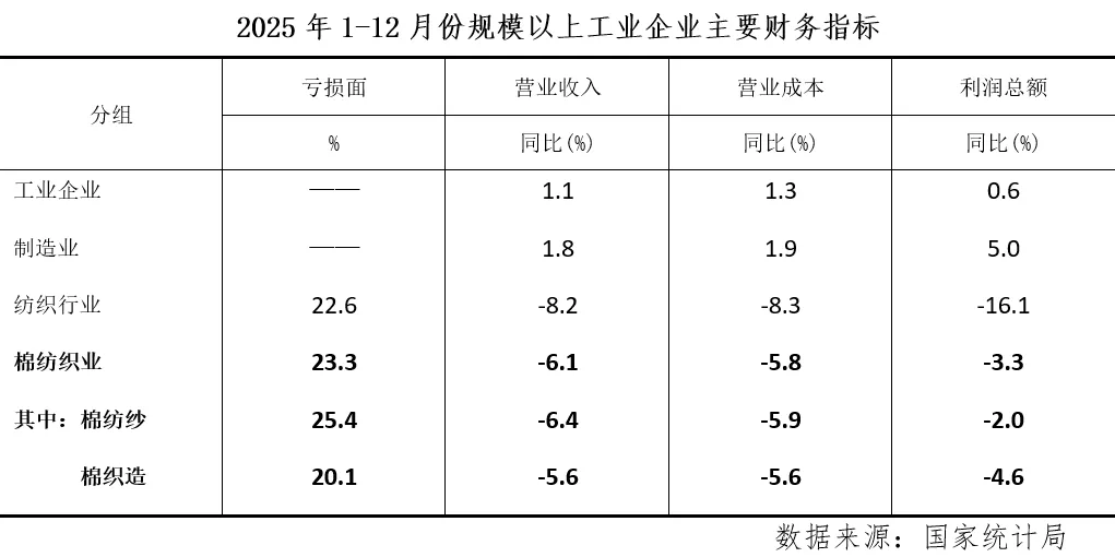 据国家统计局数据,2025年1-12月规模以上棉纺织企业营业收入同比下降6.1%,降幅较上月累计扩大2.2个百分点,利润总额同比下降3.3%,年内累计首次转为下降,利润降幅低于营收降幅致利润率延续修复达到2.30%,为全年月度累计最高值。