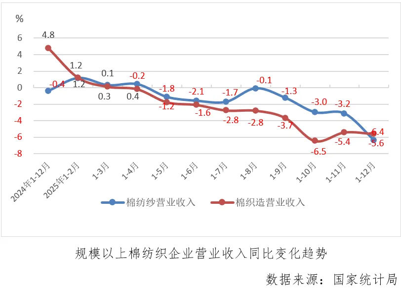 1-12月份,规模以上棉纺织企业营业收入同比下降6.1%,连续8个月累计下降,降幅较上月累计扩大2.2个百分点,其中棉纺纱和棉织造下降幅度分别为6.4%和5.6%,棉纺纱较上月累计扩大3.2个百分点,棉织造较上月累计扩大0.2个百分点。
