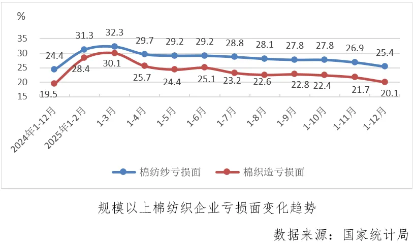 1-12月份,规模以上棉纺织企业亏损面为23.3%,较1-11月份收缩1.5个百分点,继续降至年内最低点,其中棉纺纱亏损面为25.4%,较上月收缩1.5个百分点,棉织造亏损面为20.1%,较上月累计收缩1.6个百分点,棉纺纱和棉织造亏损面均继续收缩至年内最低点。