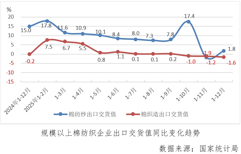 1-12月份,规模以上棉纺织企业出口交货值同比下降0.6%,延续上月下降趋势但降幅有所收窄,其中棉纺纱同比增长1.8%,由上月累计下降转为增长,棉织造累计同比下降1.6%,降幅较上月累计扩大0.5个百分点。