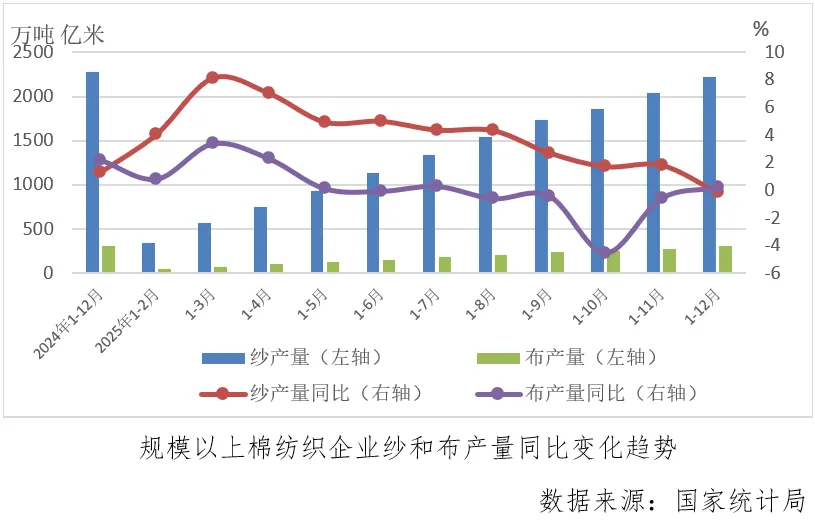 1-12月份,规模以上纱产量为2215.8万吨,同比下降0.12%,由上月累计增长转为下降,规模以上布产量为306.7亿米,同比增长0.23%,由上月累计微降转为微增。