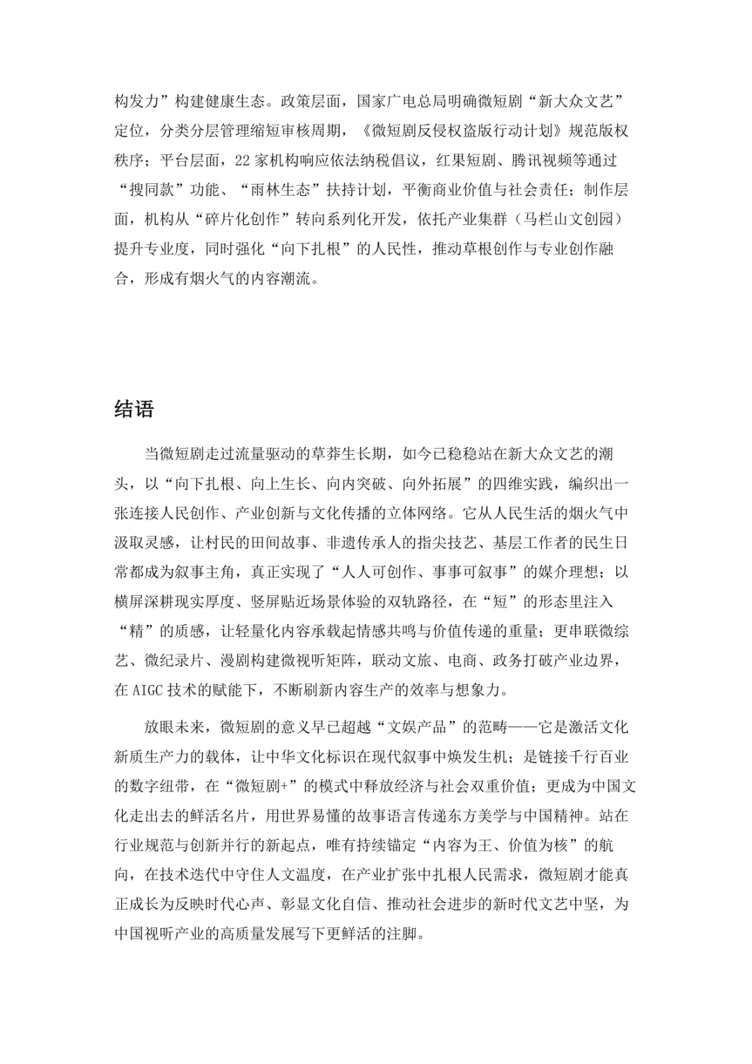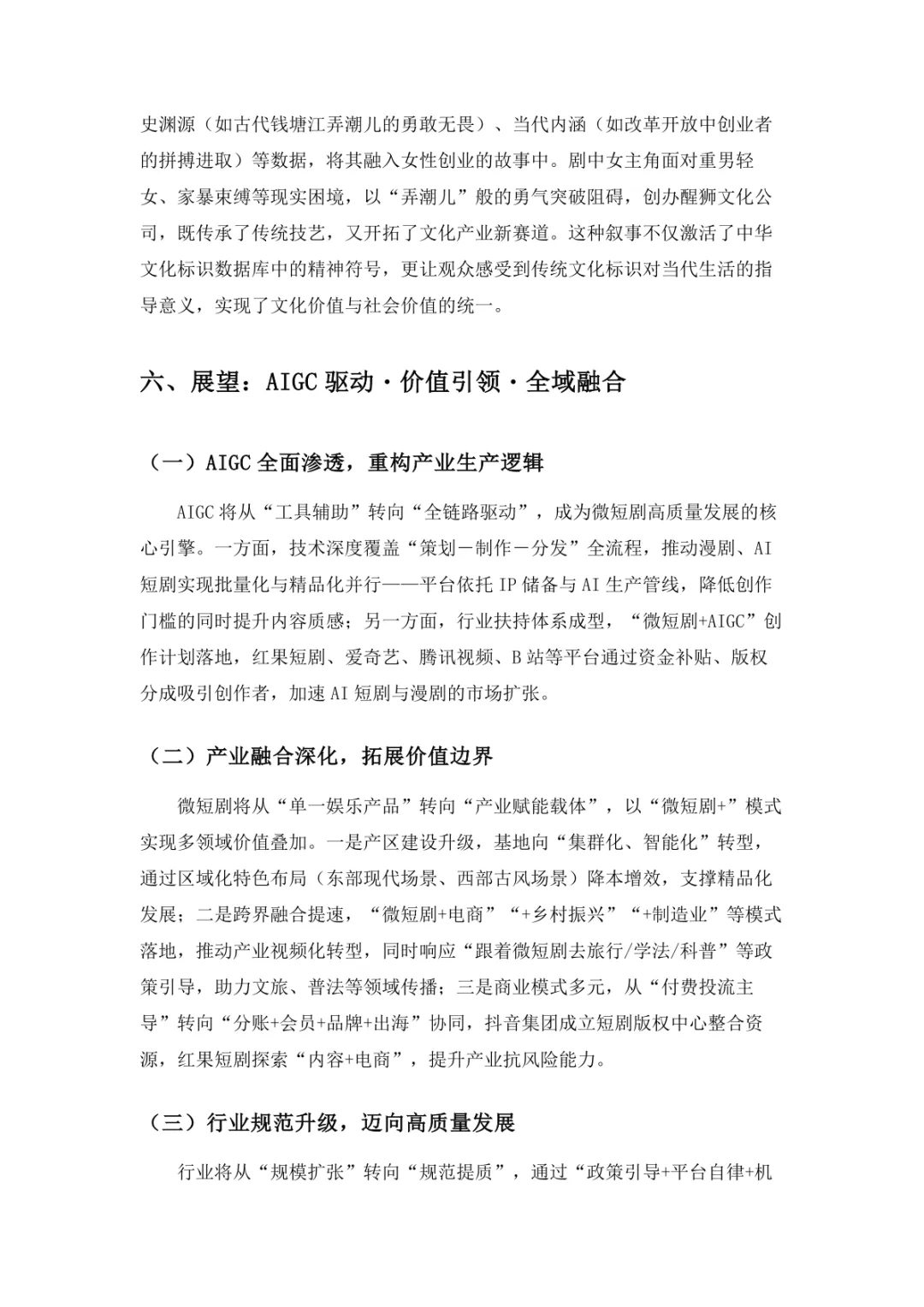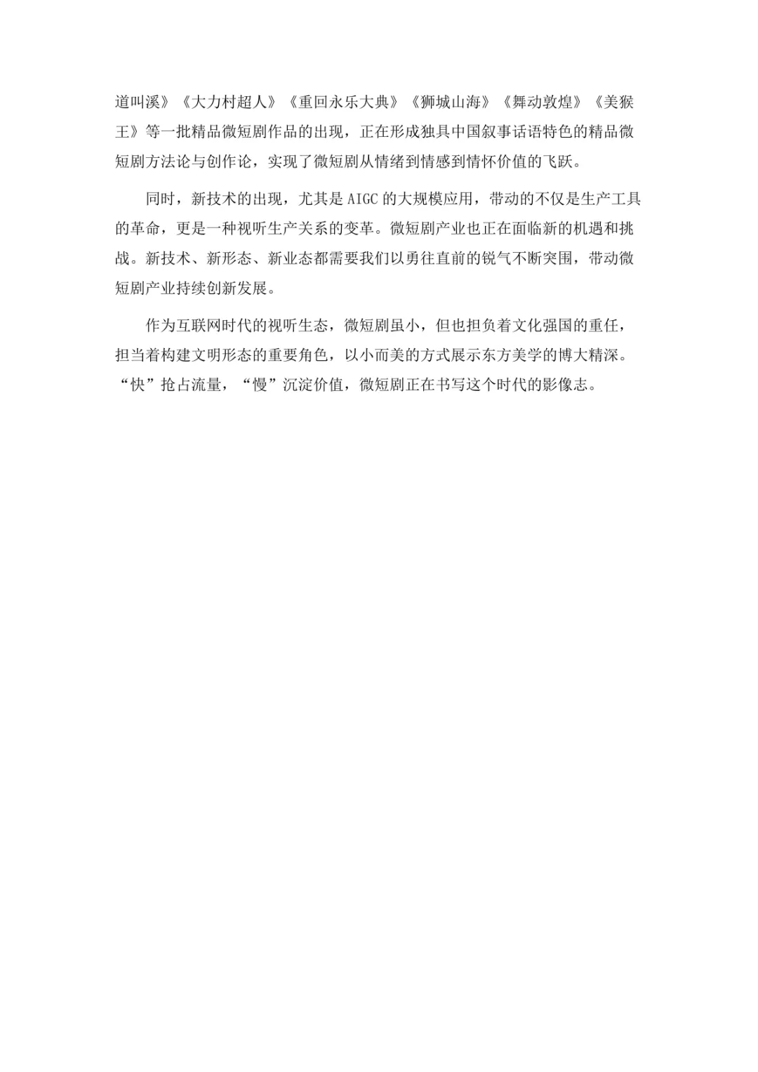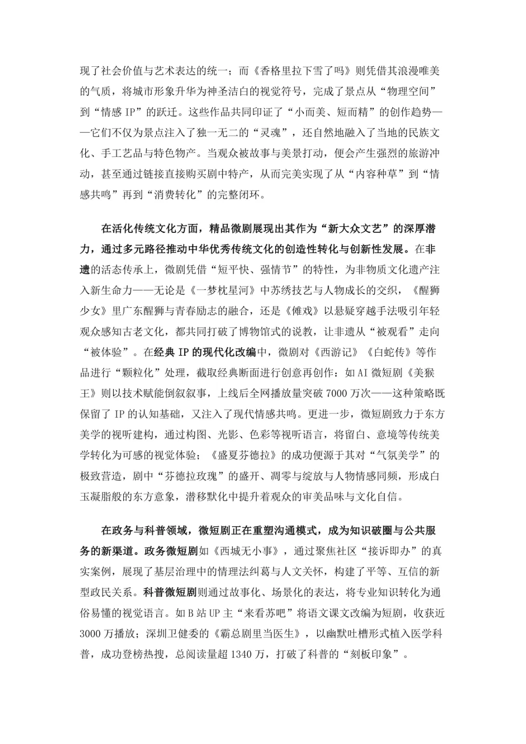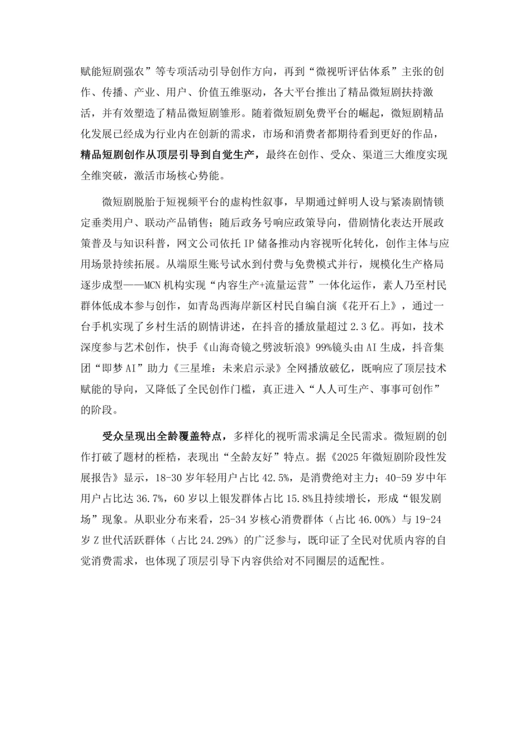 导读:微短剧作为 “新大众文艺” 典型代表,深度融合普法、传统文化、乡村振兴等社会文化领域,实现从 “情绪刺激” 到 “情感共鸣”、“流量导向” 到 “价值沉淀” 的跨越。政策层面持续发力,广电总局出台多项政策引导行业规范发展,为产业繁荣奠定基础。用户群体广泛,Z 世代为重要参与力量,抖音、微信视频号等平台成为主要传播阵地。创作呈现 “小而美、短而精” 趋势,精品内容不断涌现,既深耕移动场景传递情感价值,也通过优质叙事承载情怀内涵。产业融合持续深化,形成 “一剧带一景” 传播矩阵,联动文旅、品牌营销等多领域开辟价值蓝海。同时面临盗版侵权、AIGC 影响等行业挑战,需通过强化内容精品化、完善版权保护、优化创作生态,推动行业行稳致远,持续发挥新大众文艺的引领效应。