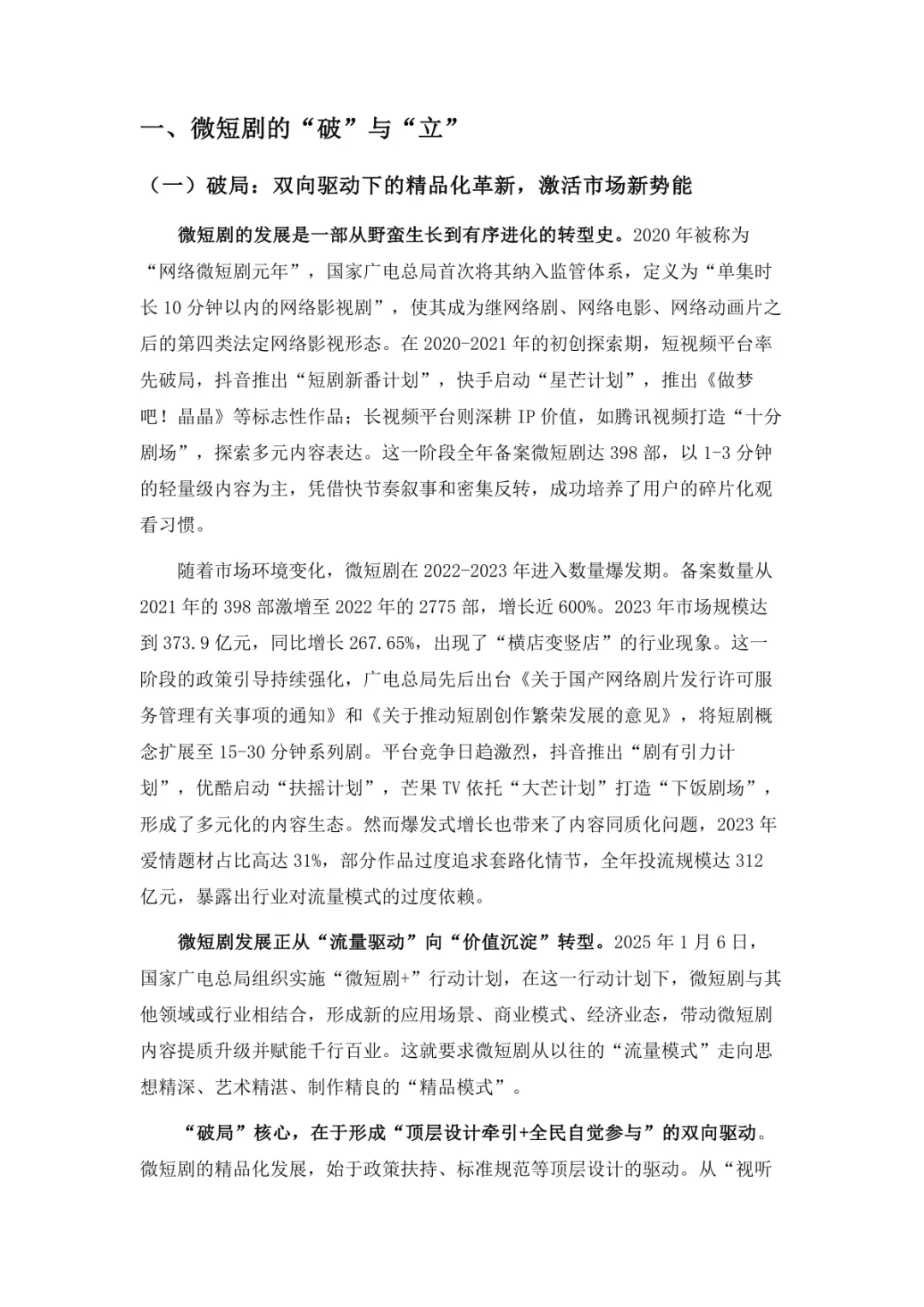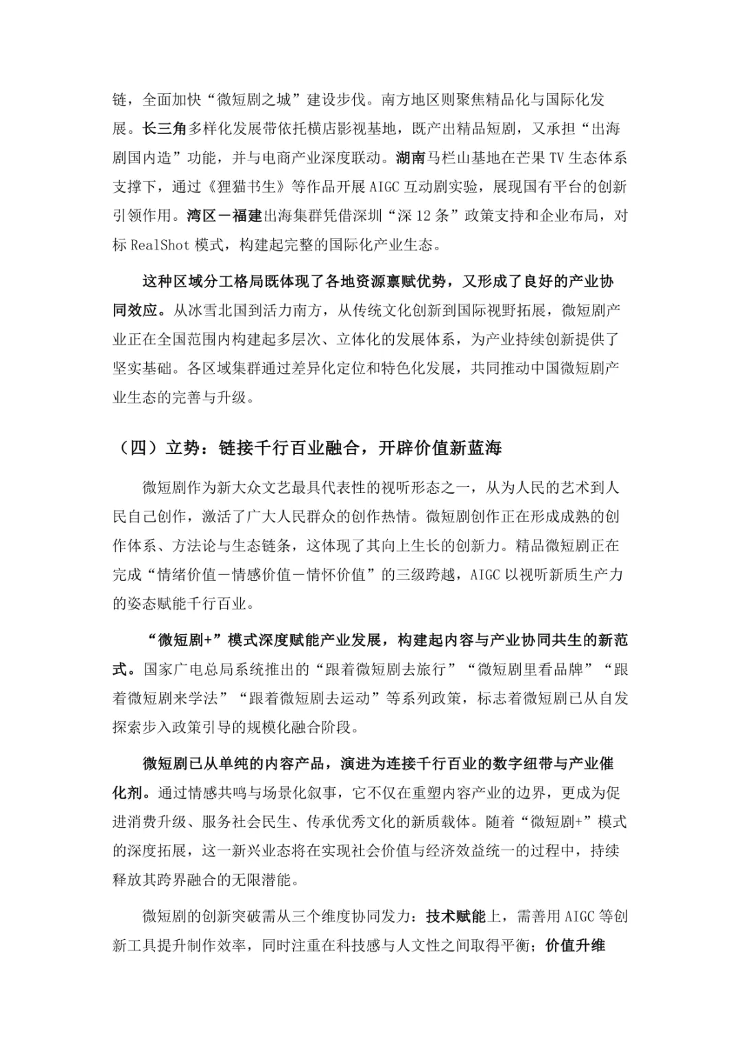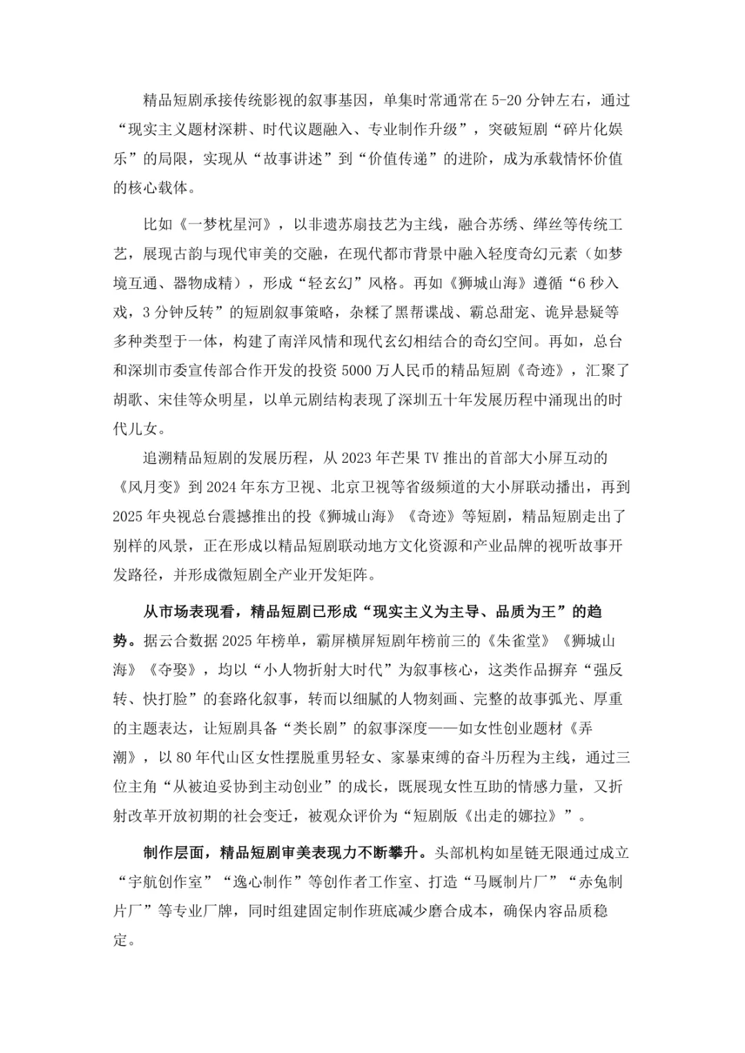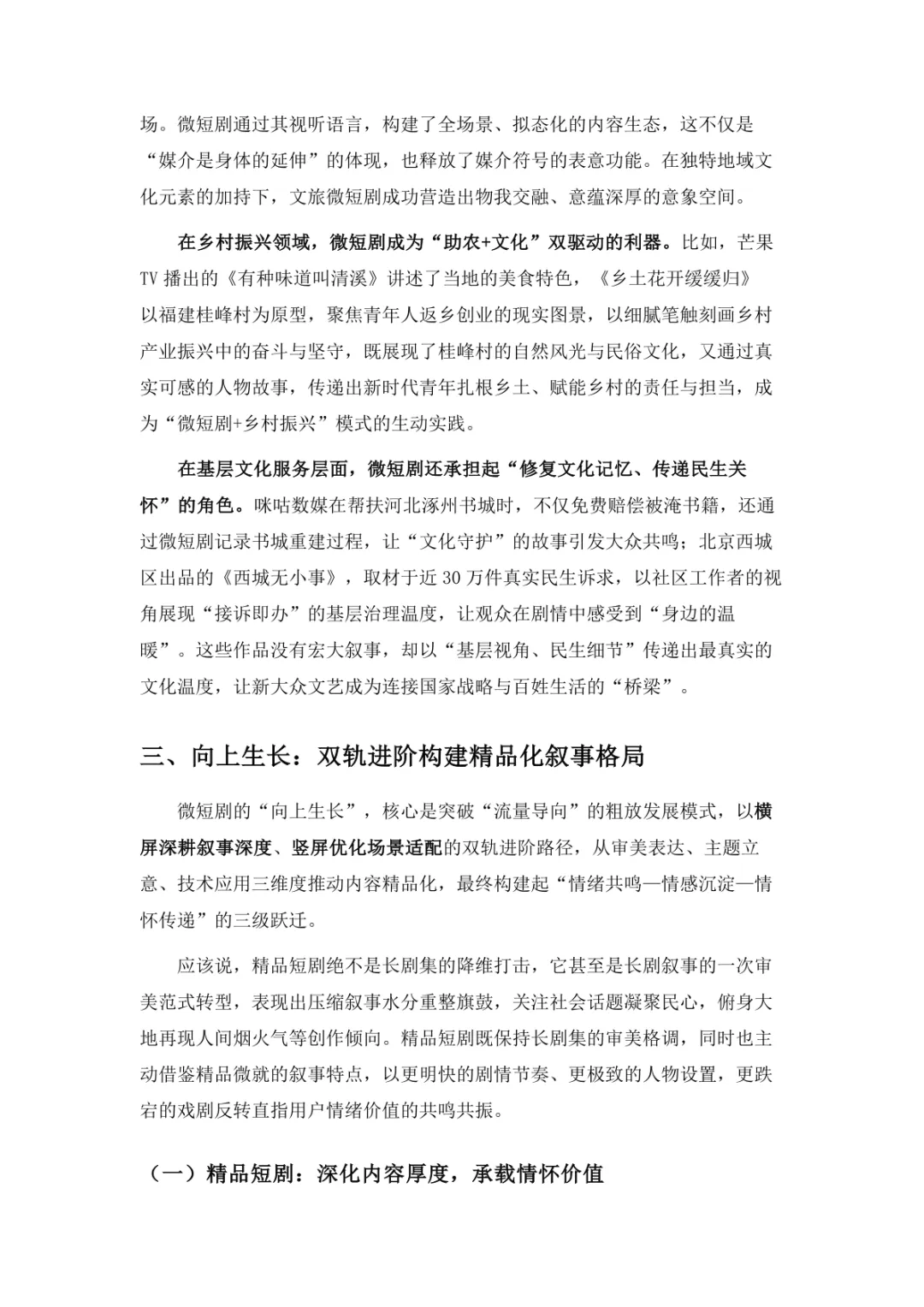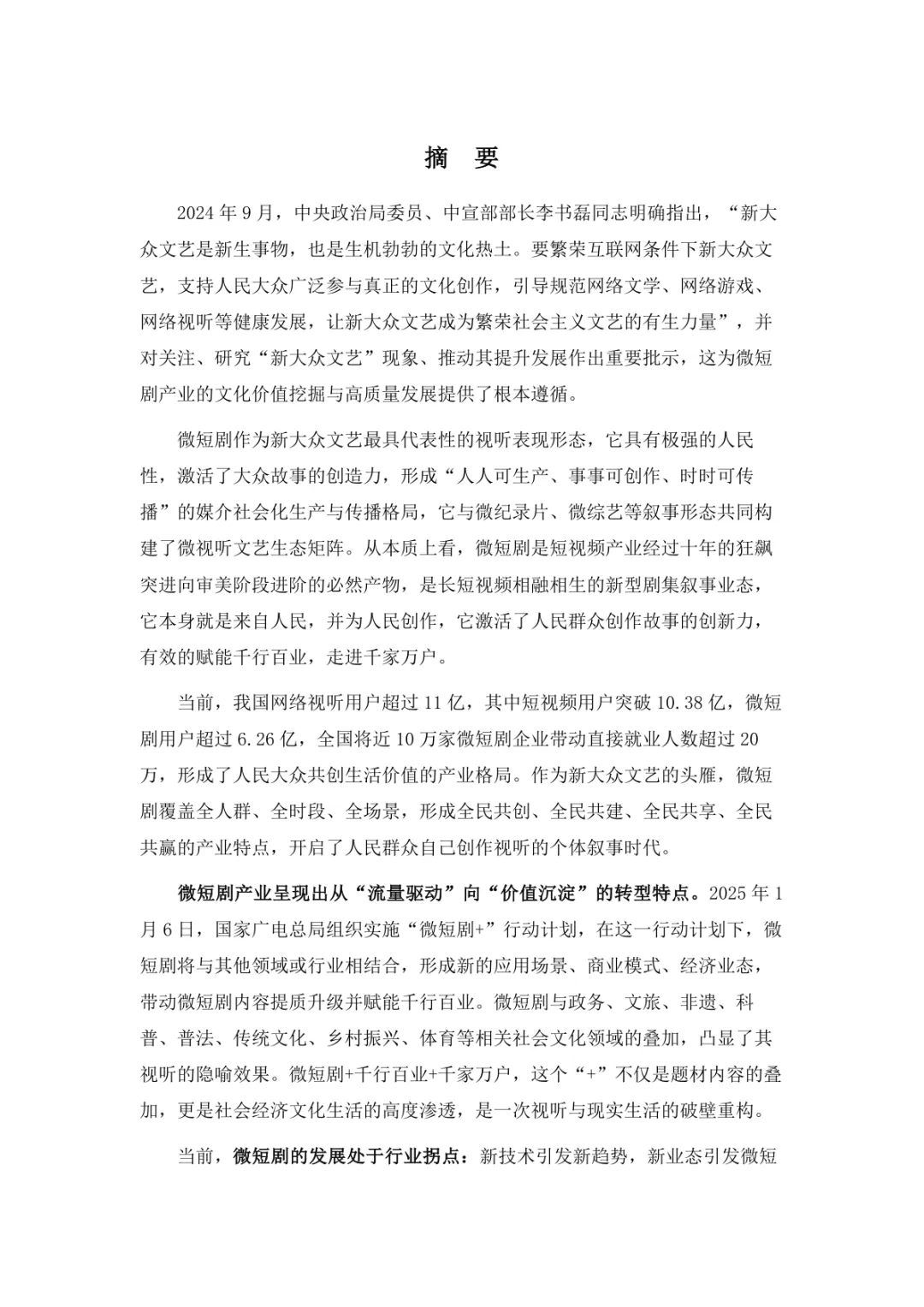 导读:微短剧作为 “新大众文艺” 典型代表,深度融合普法、传统文化、乡村振兴等社会文化领域,实现从 “情绪刺激” 到 “情感共鸣”、“流量导向” 到 “价值沉淀” 的跨越。政策层面持续发力,广电总局出台多项政策引导行业规范发展,为产业繁荣奠定基础。用户群体广泛,Z 世代为重要参与力量,抖音、微信视频号等平台成为主要传播阵地。创作呈现 “小而美、短而精” 趋势,精品内容不断涌现,既深耕移动场景传递情感价值,也通过优质叙事承载情怀内涵。产业融合持续深化,形成 “一剧带一景” 传播矩阵,联动文旅、品牌营销等多领域开辟价值蓝海。同时面临盗版侵权、AIGC 影响等行业挑战,需通过强化内容精品化、完善版权保护、优化创作生态,推动行业行稳致远,持续发挥新大众文艺的引领效应。