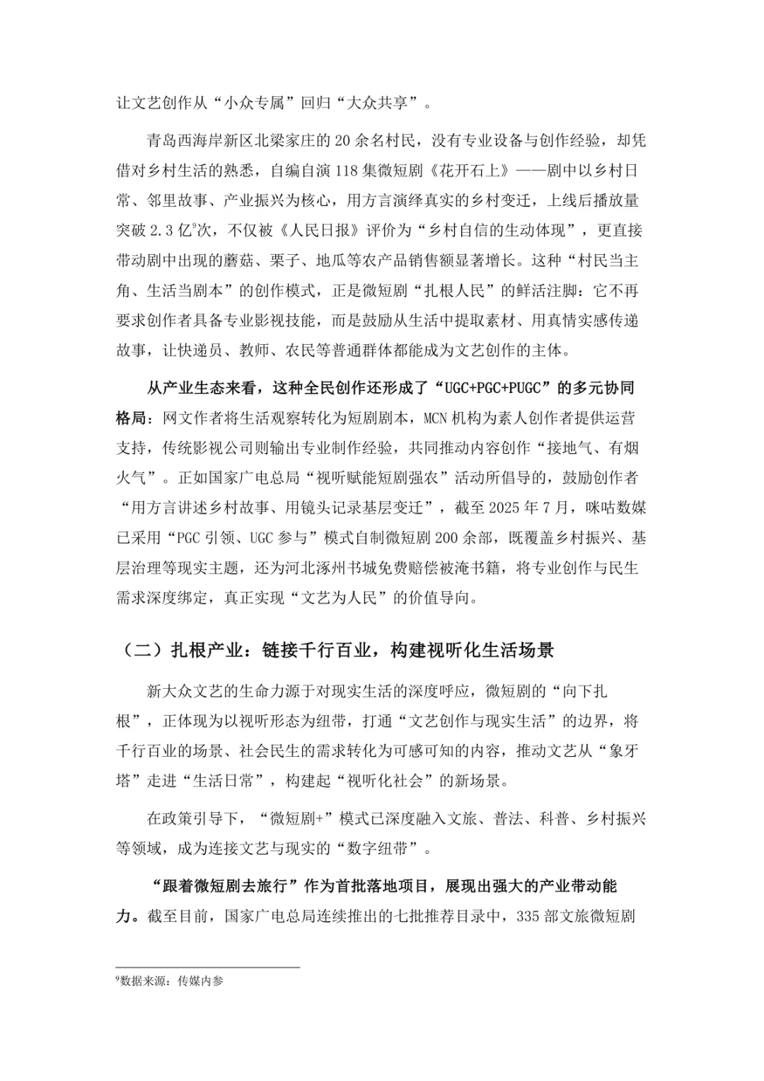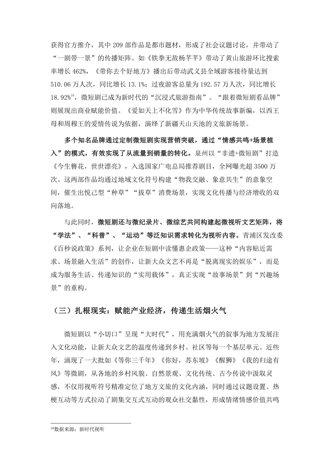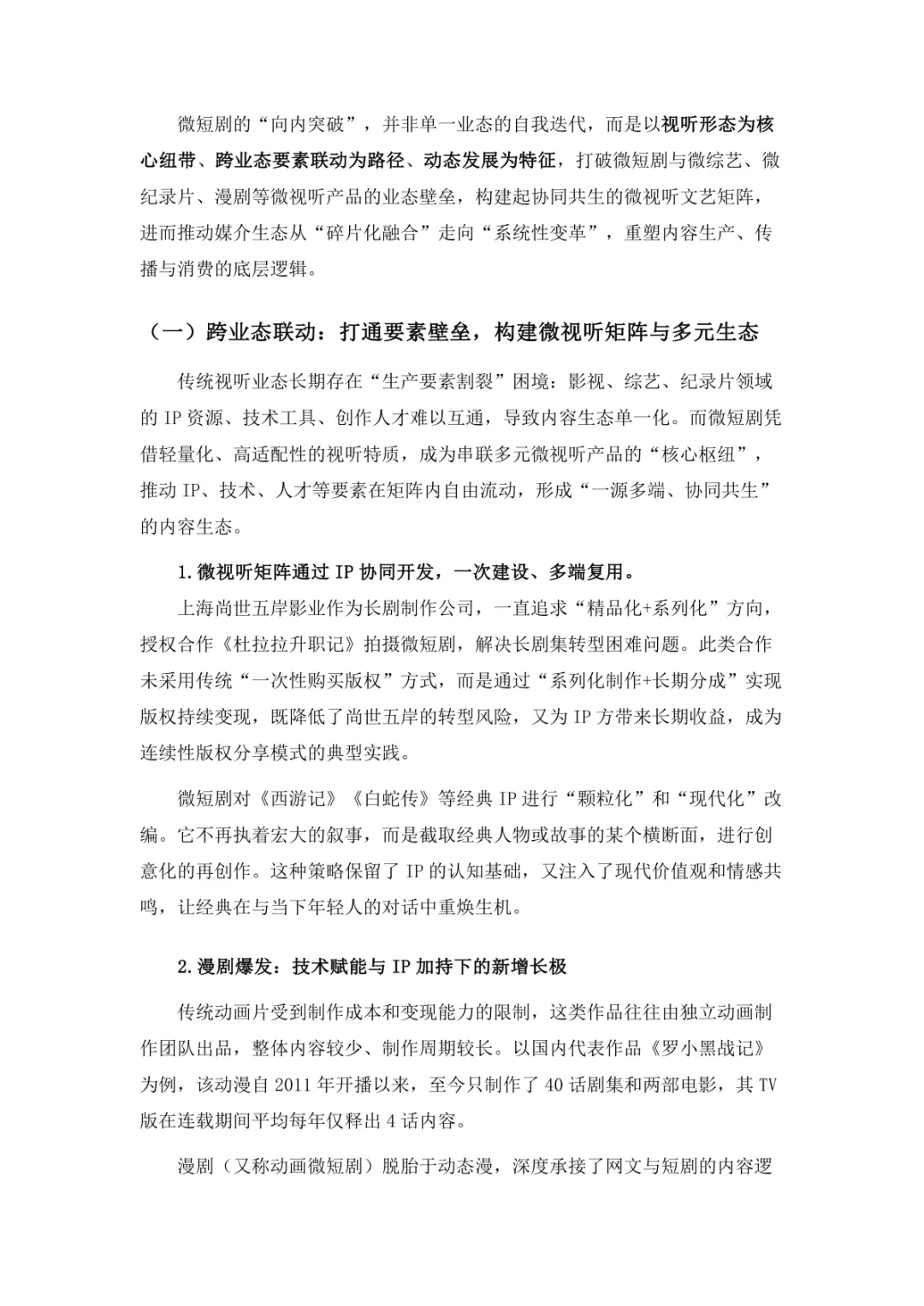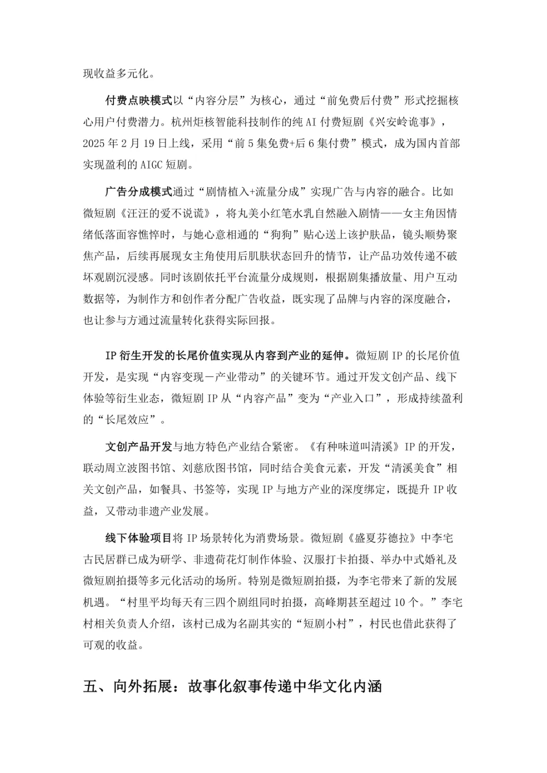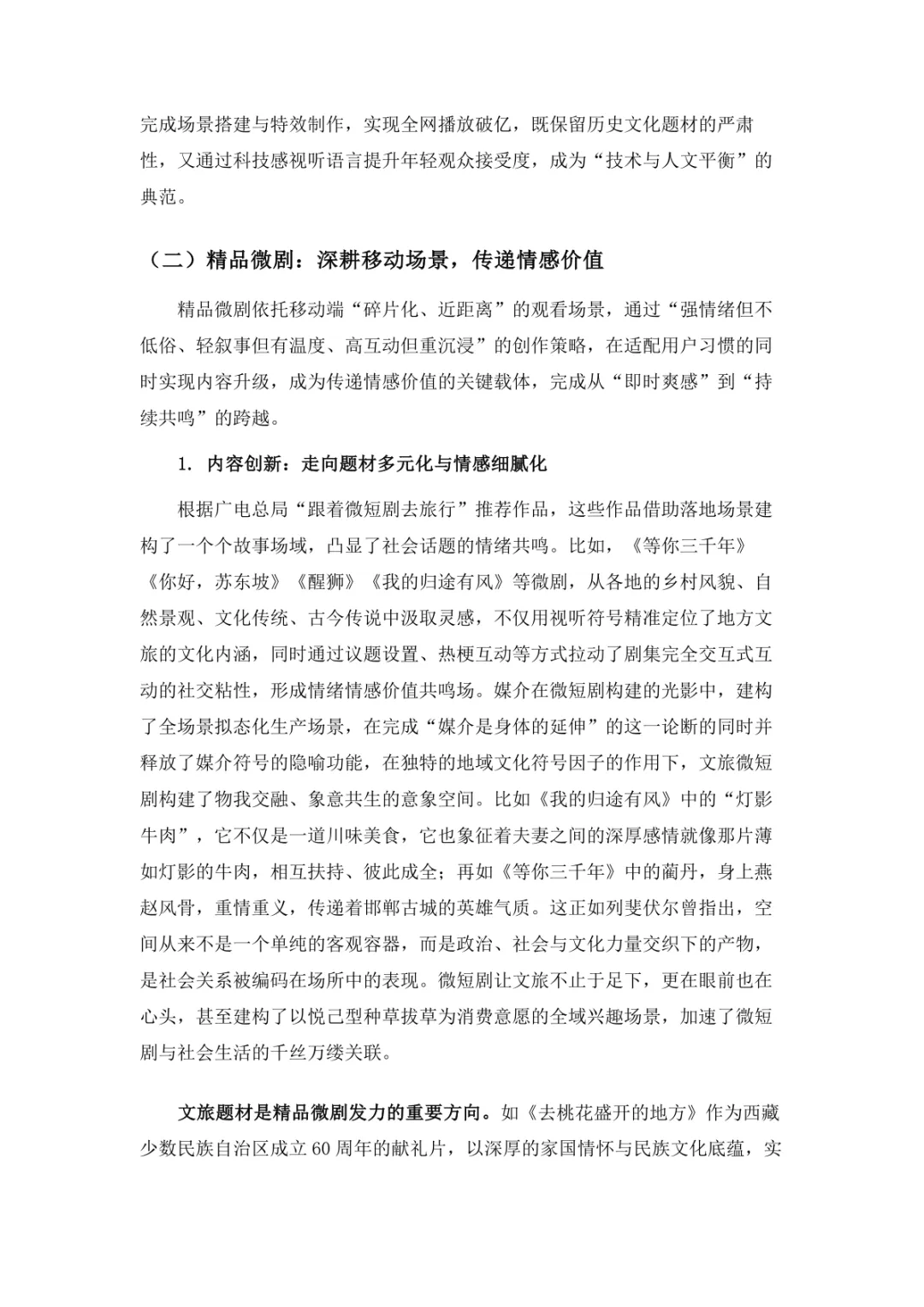 导读:微短剧作为 “新大众文艺” 典型代表,深度融合普法、传统文化、乡村振兴等社会文化领域,实现从 “情绪刺激” 到 “情感共鸣”、“流量导向” 到 “价值沉淀” 的跨越。政策层面持续发力,广电总局出台多项政策引导行业规范发展,为产业繁荣奠定基础。用户群体广泛,Z 世代为重要参与力量,抖音、微信视频号等平台成为主要传播阵地。创作呈现 “小而美、短而精” 趋势,精品内容不断涌现,既深耕移动场景传递情感价值,也通过优质叙事承载情怀内涵。产业融合持续深化,形成 “一剧带一景” 传播矩阵,联动文旅、品牌营销等多领域开辟价值蓝海。同时面临盗版侵权、AIGC 影响等行业挑战,需通过强化内容精品化、完善版权保护、优化创作生态,推动行业行稳致远,持续发挥新大众文艺的引领效应。