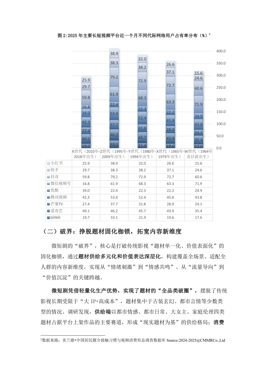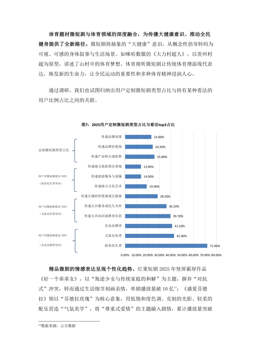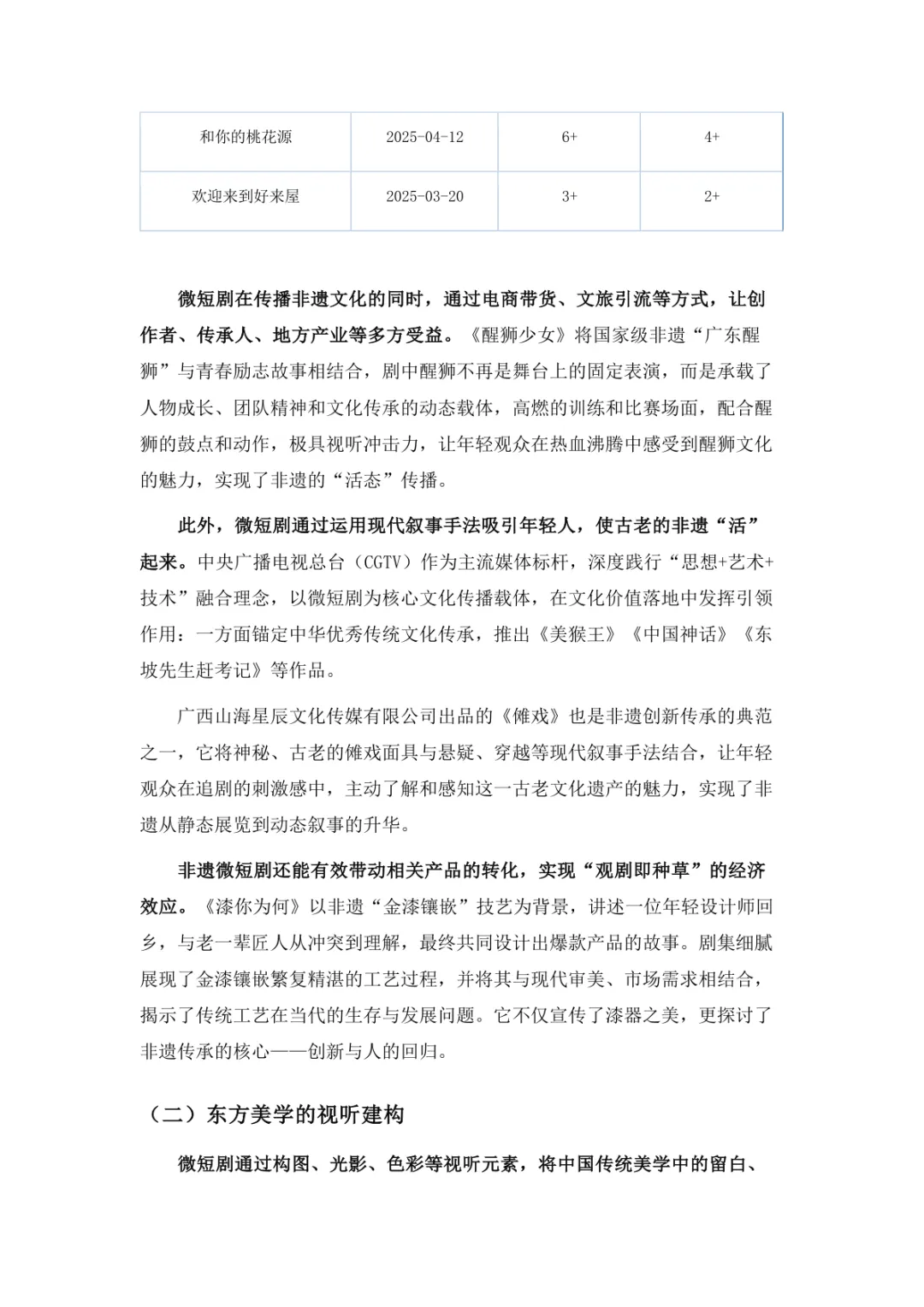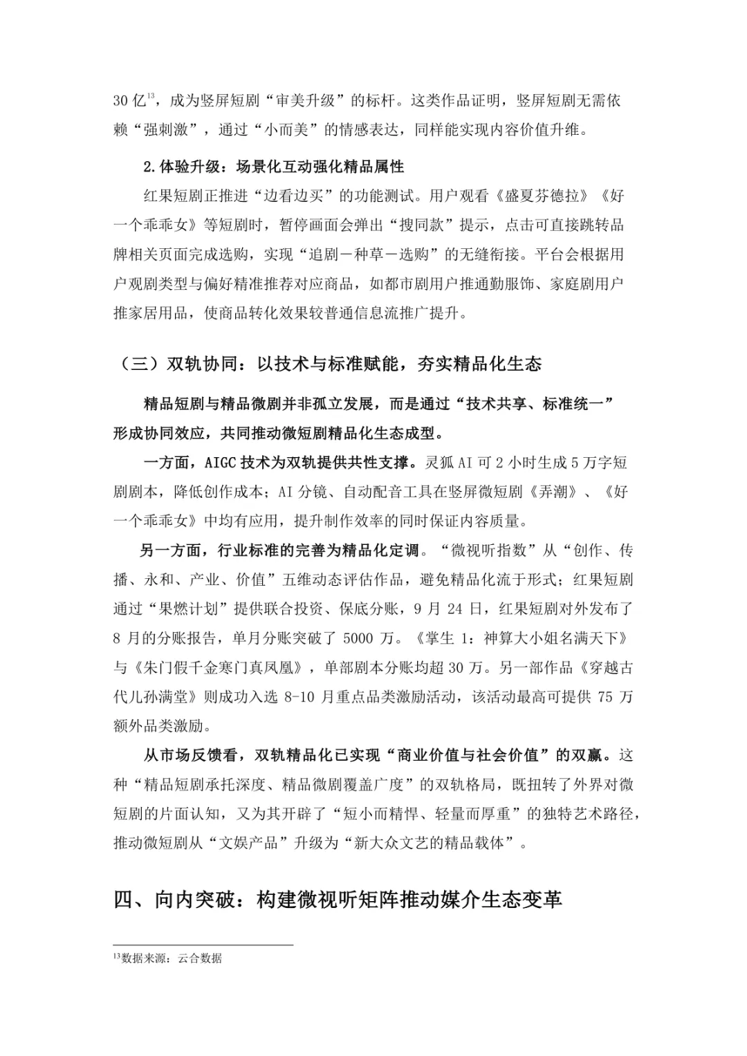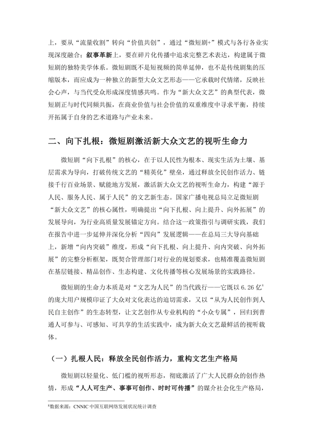 导读:微短剧作为 “新大众文艺” 典型代表,深度融合普法、传统文化、乡村振兴等社会文化领域,实现从 “情绪刺激” 到 “情感共鸣”、“流量导向” 到 “价值沉淀” 的跨越。政策层面持续发力,广电总局出台多项政策引导行业规范发展,为产业繁荣奠定基础。用户群体广泛,Z 世代为重要参与力量,抖音、微信视频号等平台成为主要传播阵地。创作呈现 “小而美、短而精” 趋势,精品内容不断涌现,既深耕移动场景传递情感价值,也通过优质叙事承载情怀内涵。产业融合持续深化,形成 “一剧带一景” 传播矩阵,联动文旅、品牌营销等多领域开辟价值蓝海。同时面临盗版侵权、AIGC 影响等行业挑战,需通过强化内容精品化、完善版权保护、优化创作生态,推动行业行稳致远,持续发挥新大众文艺的引领效应。