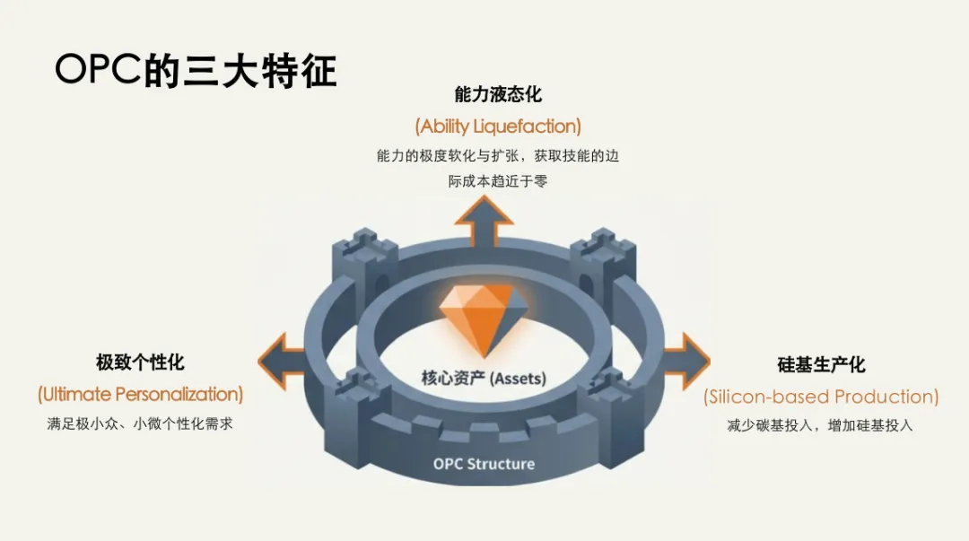 报告详细阐述了OPC的三大特征:能力液态化、极致个性化和硅基生产化。能力液态化指AI填平技能洼地,创始人不再有明显短板,通过鉴赏力(评判输出质量)和提问力(精准描述需求)实现能力软化与扩张。极致个性化强调工作流适应人而非人适应工作流,满足小微需求,AI提供无限知识组合路径。硅基生产化则指AI作为组织架构核心,减少碳基(人力)投入,增加硅基(技术)投入,实现线性碳基生产力与指数硅基生产力的结合,形成新质生产力。报告用图片对比传统碳基逻辑中“人雇佣人”与OPC模式下“人指挥AI数字员工”的差异