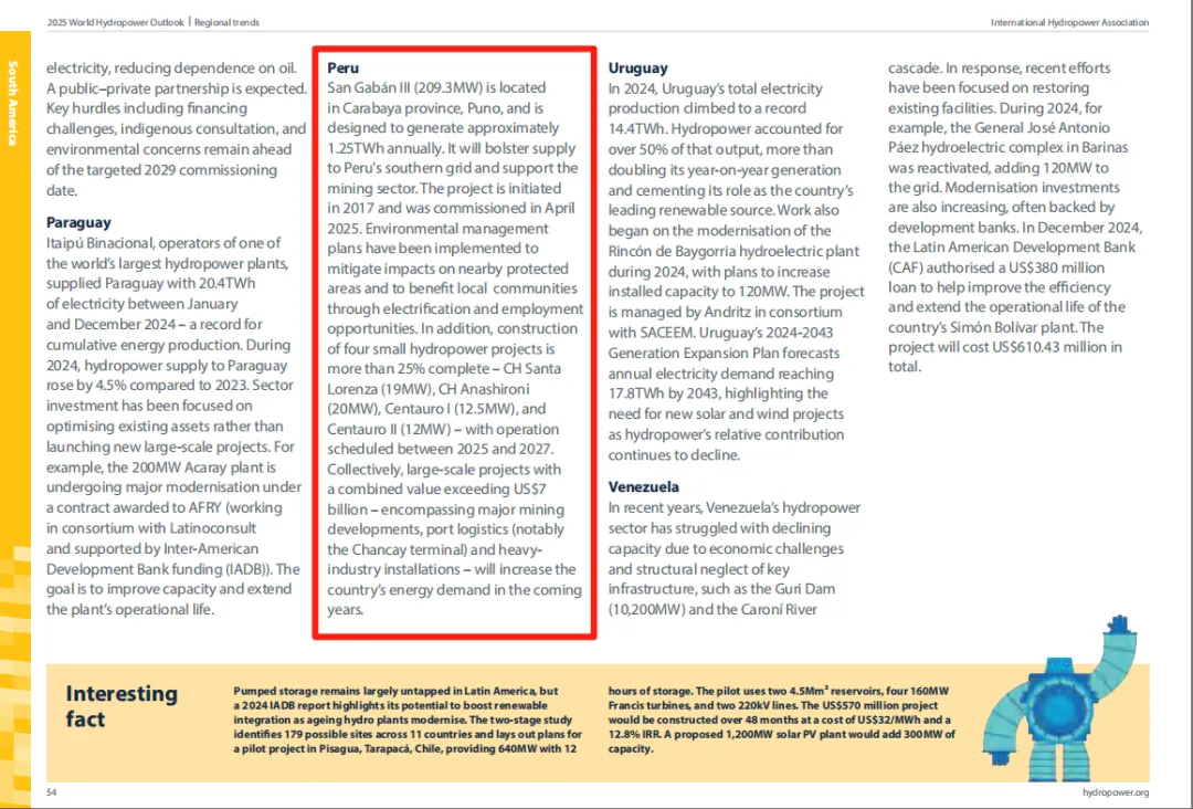 第五个就是报告第54页,在介绍秘鲁水电发展时,介绍了三峡集团秘鲁圣加旺Ⅲ水电站项目,该电站装机容量209.3MW,年发电量约12.5亿千瓦时,它将增强秘鲁南部电网的供电能力,并为矿业部门提供支持。该项目于2017年启动,2025年4月投入运营。